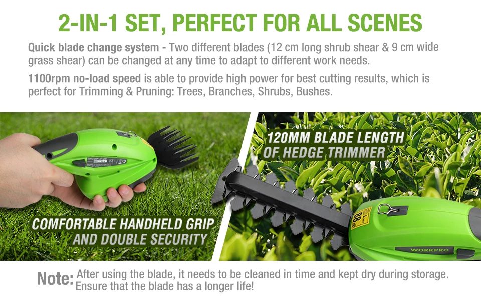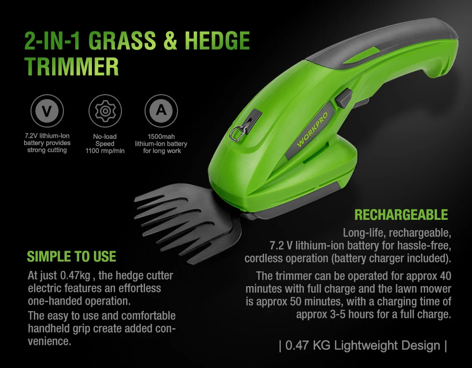 Электрический триммер WORKPRO 2 в 1, 7,2 В, литий-ионный аккумуляторный триммер для живой изгороди, перезаряжаемый триммер для стрижки живой изгороди
