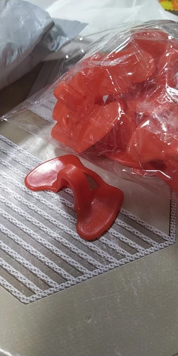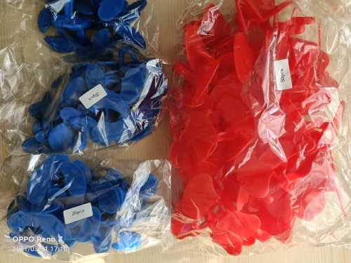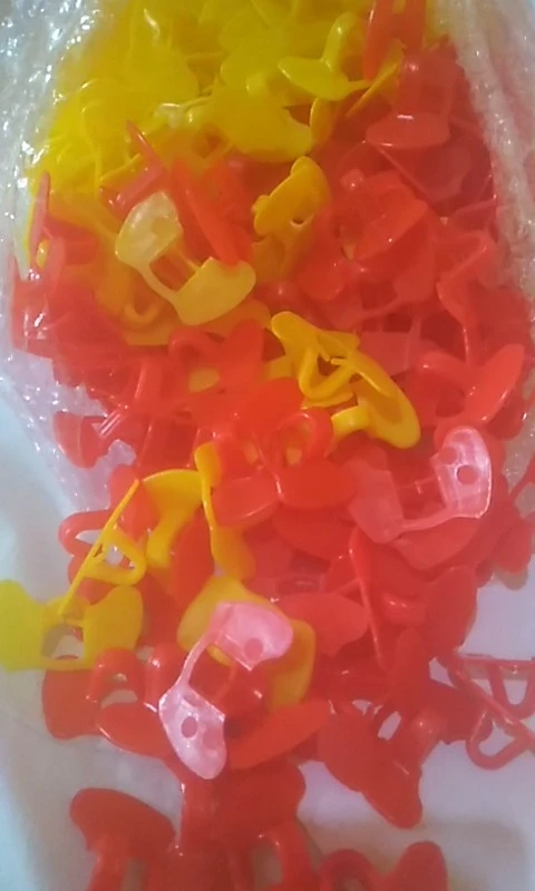 доставка до Московск. обл быстро, купила за 266рубл за 50шт. сделаны из пластика, не гнутся. размер L чуть великоват для простой несушки. Брала размер поменьше, думала маленький, но перестали клевать друг друга. При кормлении не мешает