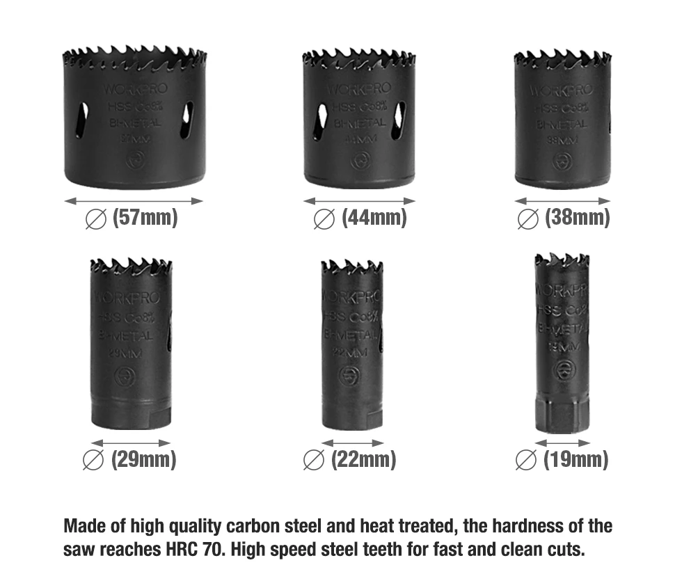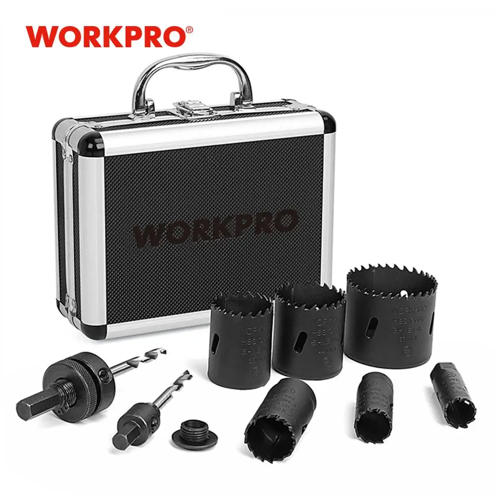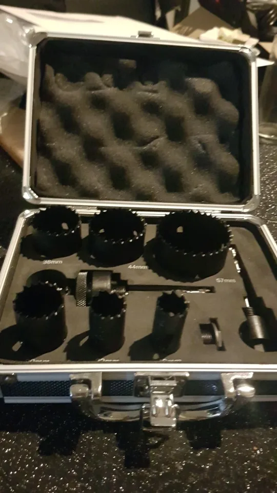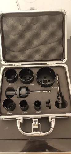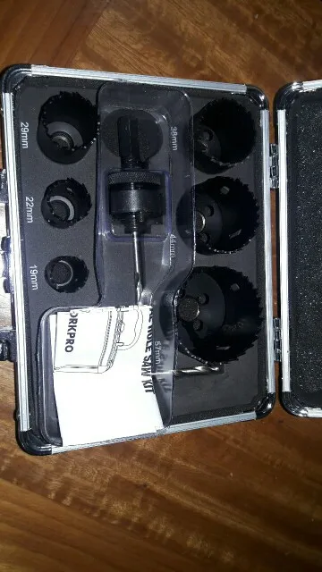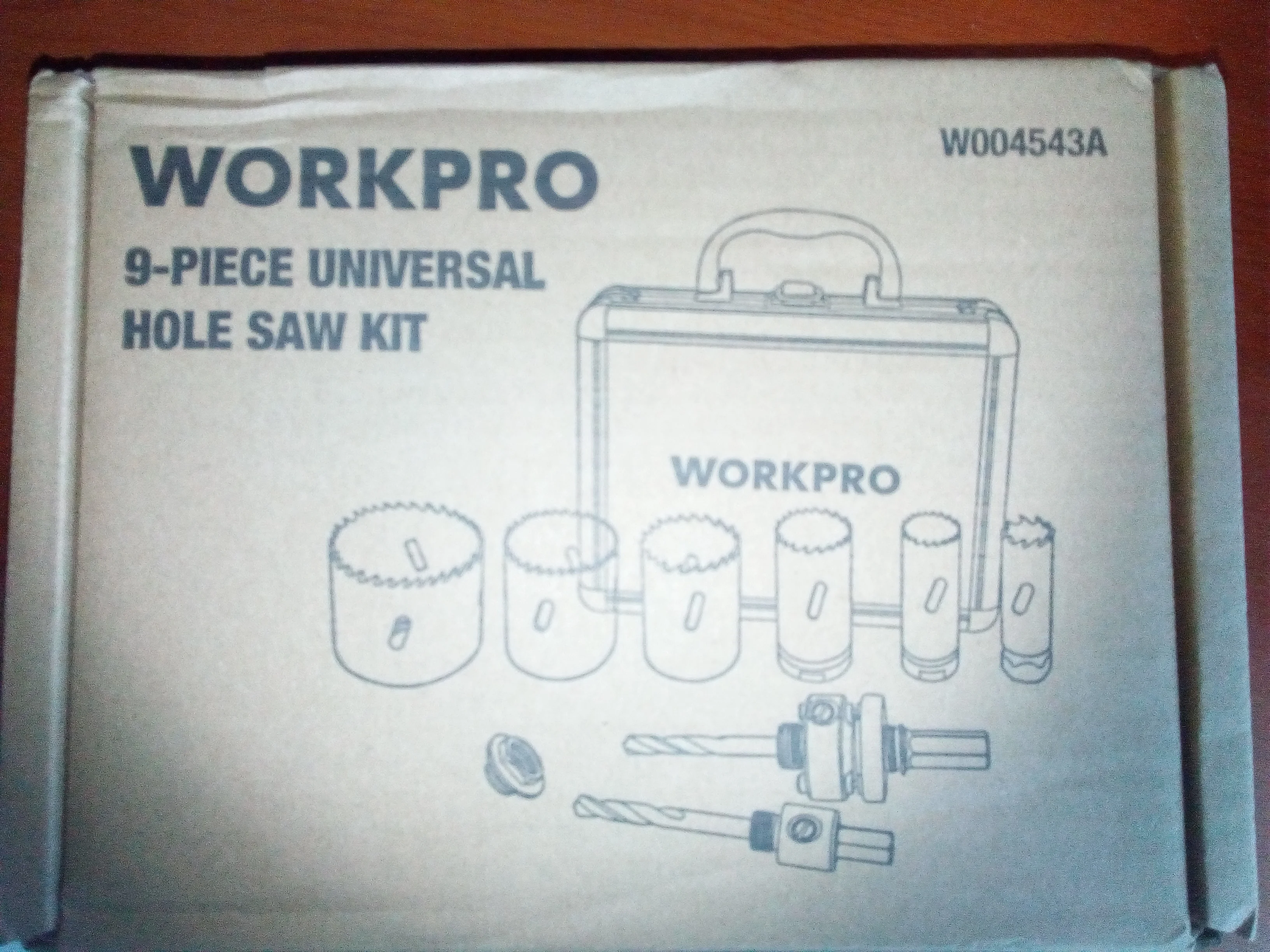Упаковка у Workpro как всегда на высоте. Классный кейс с надежным ложементом. Оправки тоже на первый взгляд неплохи. Коронки немного кривоваты. Пока не сверлил, но при вращение в сверлильном станке видно биение.
