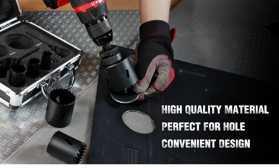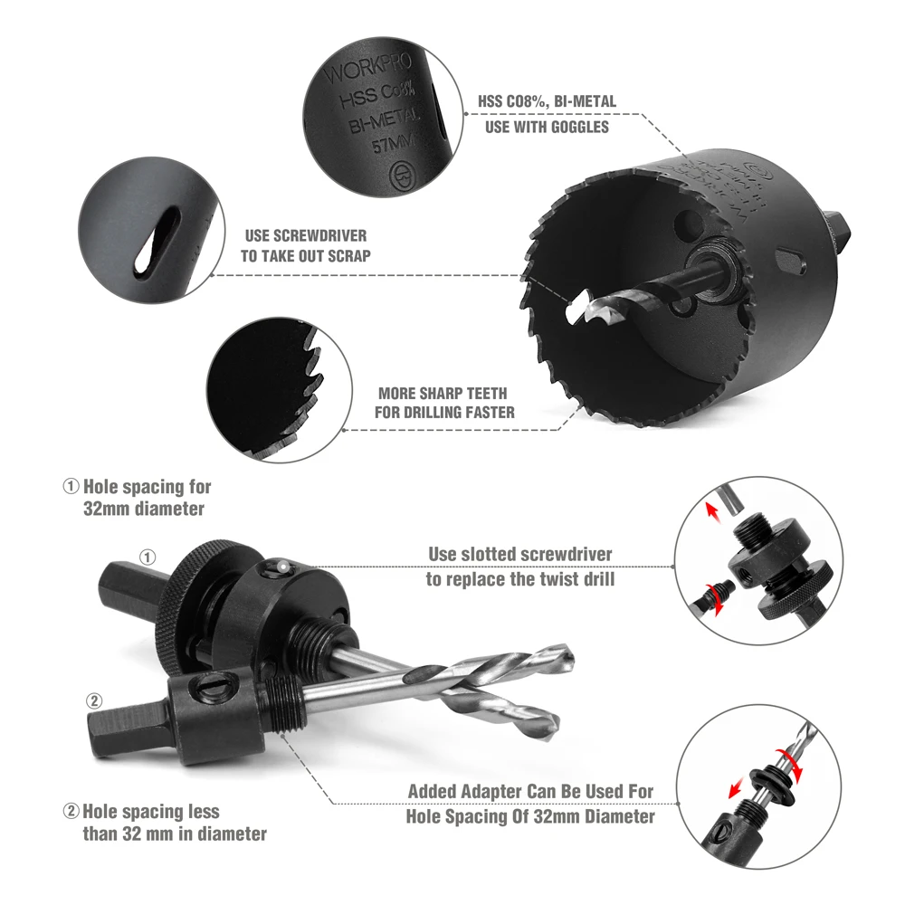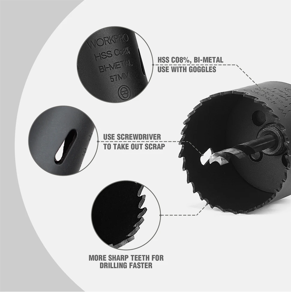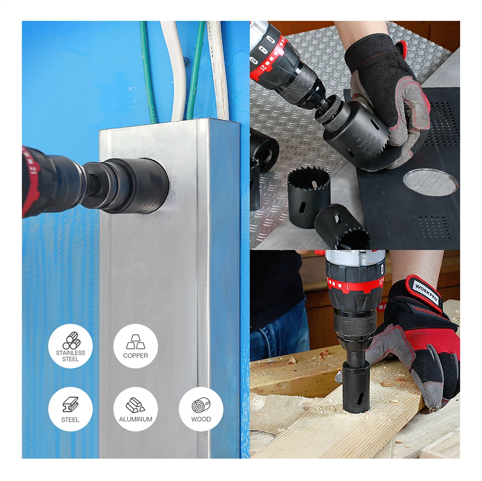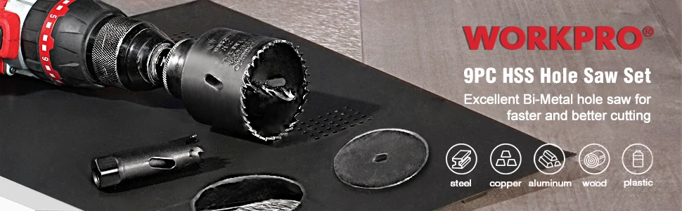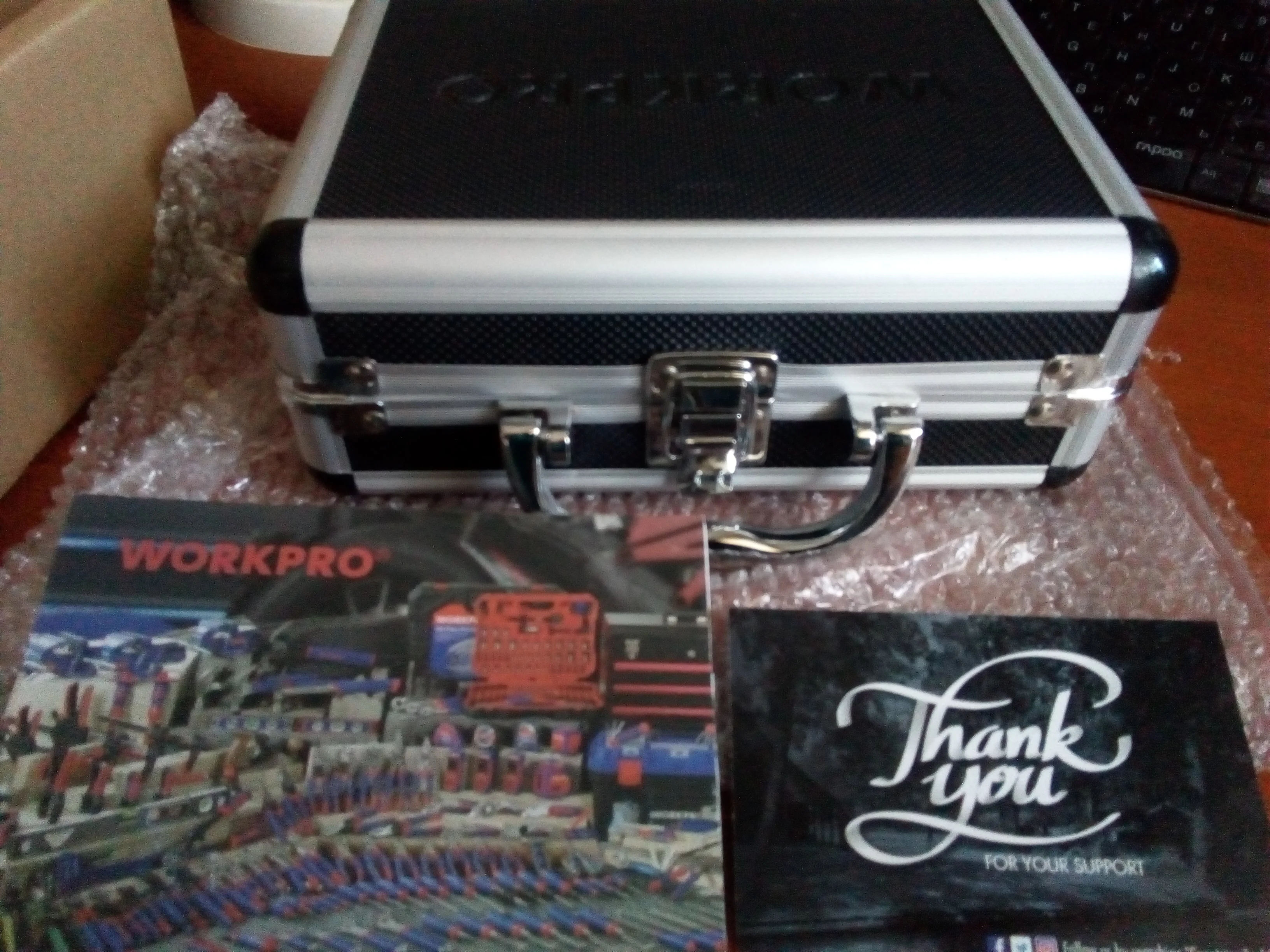 Упаковка у Workpro как всегда на высоте. Классный кейс с надежным ложементом. Оправки тоже на первый взгляд неплохи. Коронки немного кривоваты. Пока не сверлил, но при вращение в сверлильном станке видно биение.