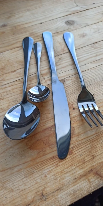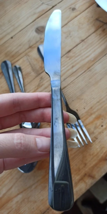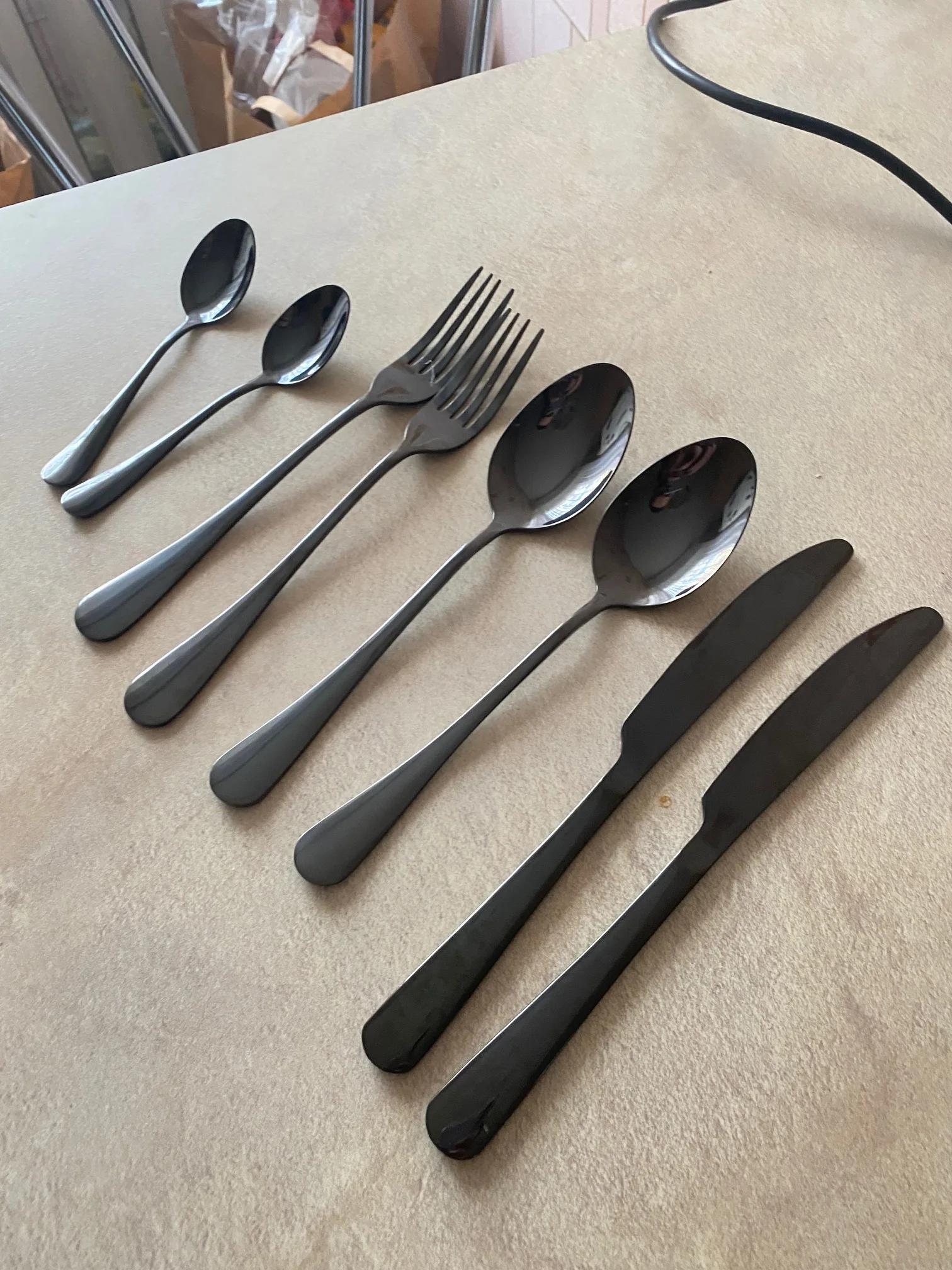 Эти столовые приборы не матовые как на фото, а глянцевые! Фотографии вводят в заблуждение, имейте в виду. Выбор пал на черный матовый комплект, а он не матовый. Соответственно, на металле очень хорошо видны отпечатки и малейшие загрязнения - см фото ножа (последнее в ряду). Ну и дёшево это конечно выглядит. Не так как матовые. В остальном - сталь не гнётся, края ровные, размер стандартный, что в принципе нормально для такой цены. Хотели себе комплект 24 шт. на кухню в стиле лофт, но видимо надо искать у другого продавца.