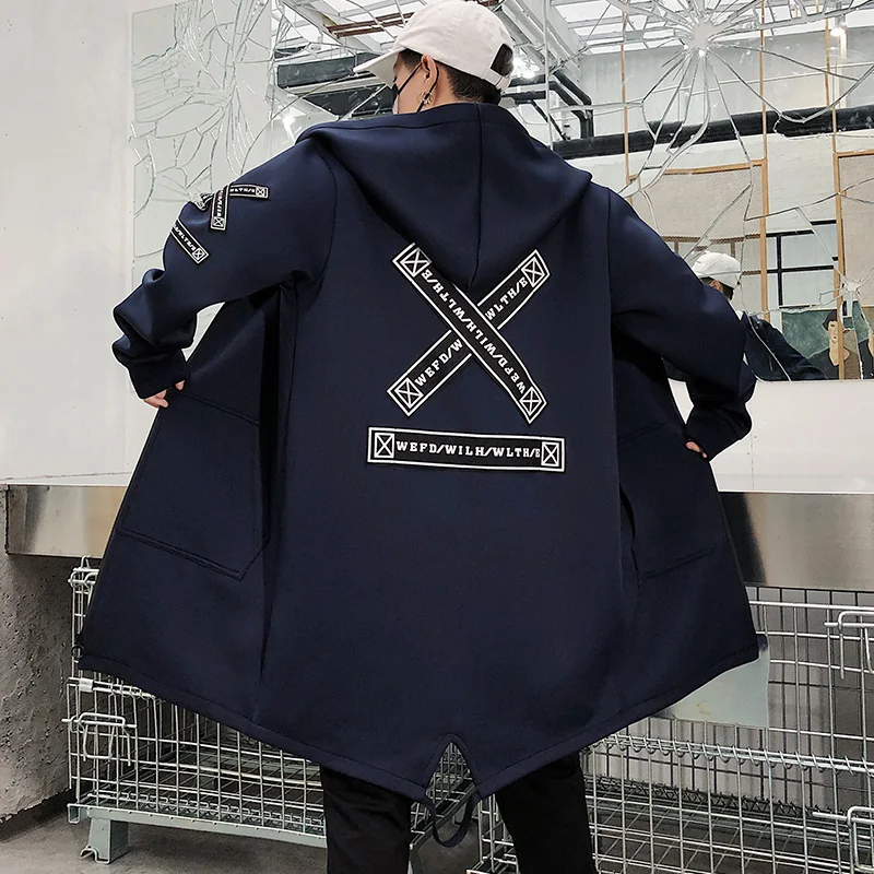 Новинка 2019 осень мужская куртка Длинная ветровка мужская повседневная теплая куртка с капюшоном черная белая модная мужская куртка с вышивкой