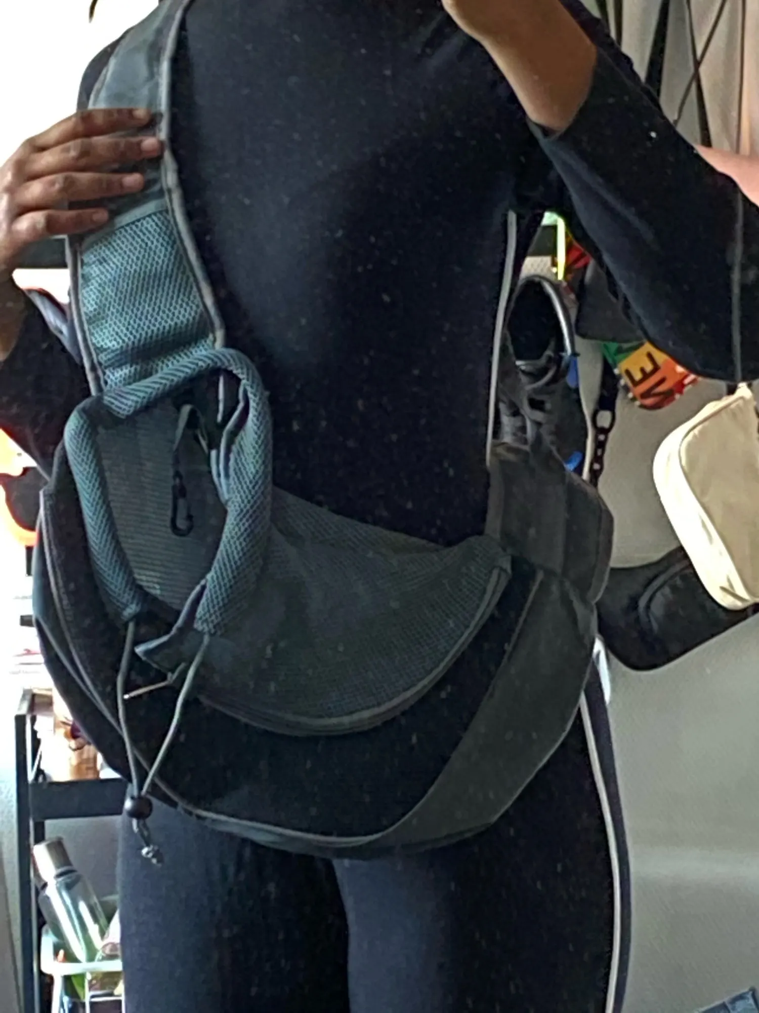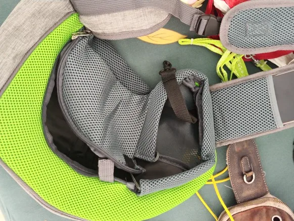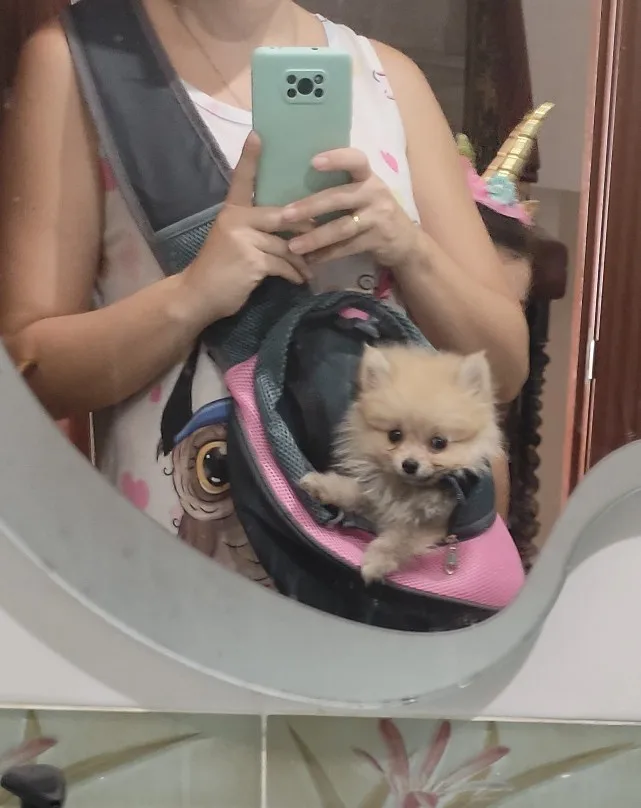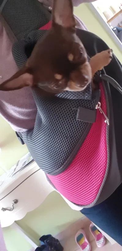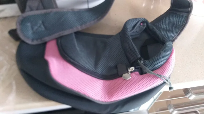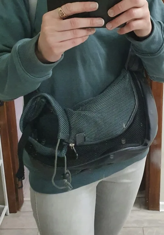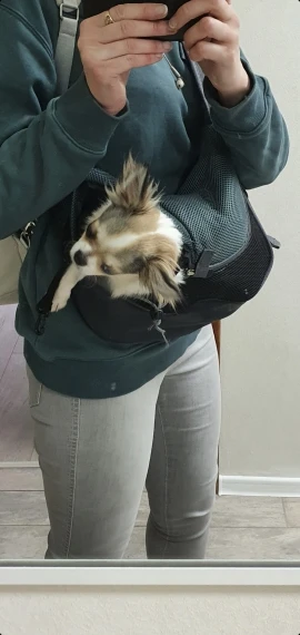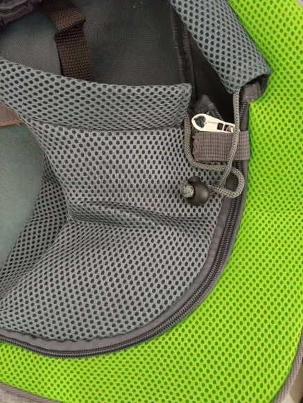 Сумка немного разочаровала: длина ремешка плохо регулируется (мне низковато, мужу маловат), йорк 2,5 кг еле помещается, передние ноги вытаскивает, надо было брать больше по размеру.
