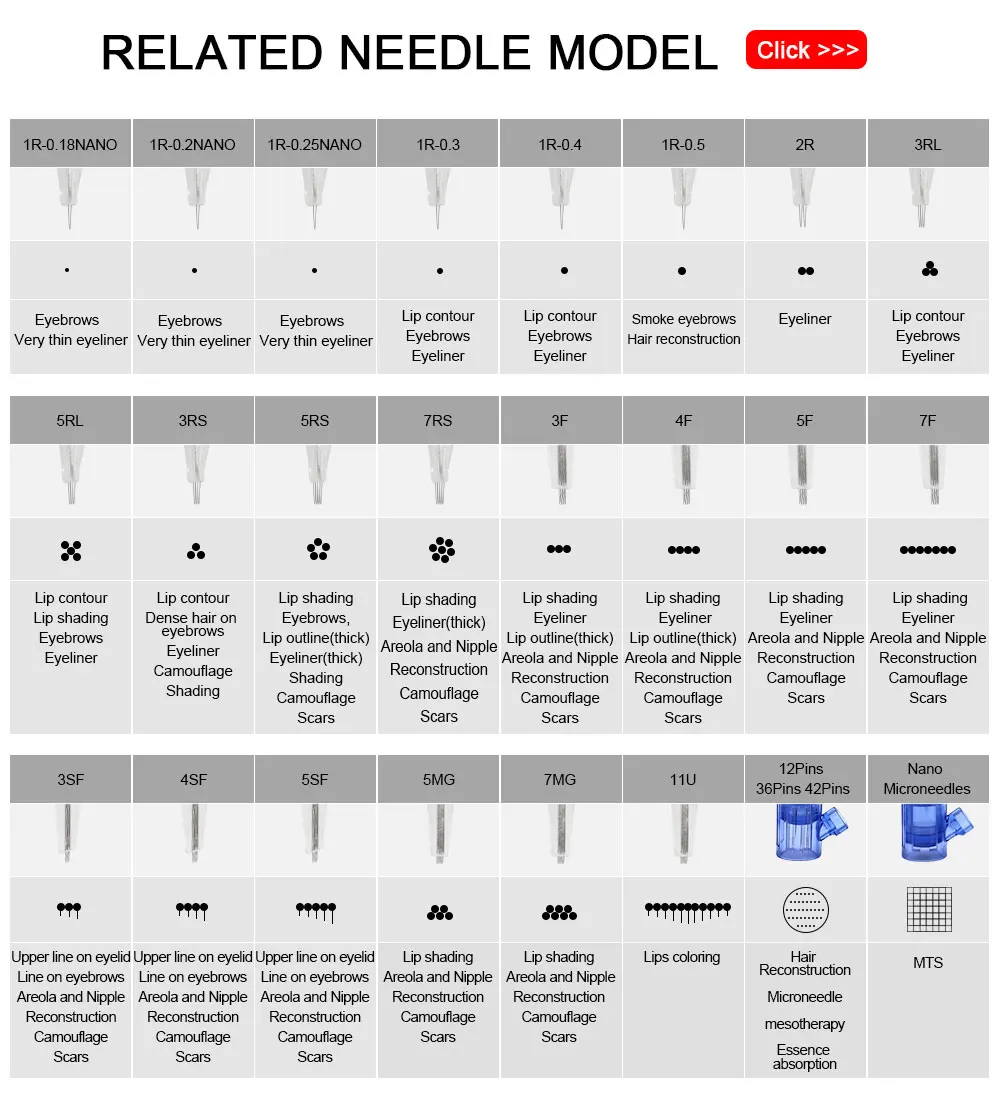 1. Какая машина может использовать эти иглы?Подходит для BMX брендовой машины, которая продается в нашем магазине. P300/HP-100/CQ003/LW002. ..2. Какой диаметр иглы?1R--0.16 мм1R--0.18 мм1р-0. 2 мм1р-0. 25 мм1р-0. 30 мм1р-0. 40 мм1р-0. 50 мм2R--0.40 мм3/5/7/RL--0.25 мм3/5/7RS--0.25 мм3/4/5SF--0.25 мм5/7MG--0.25 мм12P--0.25 мм3. Какую модель я выбираю?1R: круглая игла, подходит для тонкой подводки, бровей (самый популярный размер)2R 3RL: для подводки глаз3RL 5RL 7RL: толстая подкладка, для тумана бровей, теней для губRS: тени, бровиF /M1: для окрашивания губ12P: МТС4. Сколько времени займет доставка?Обычно занимает 2-5 недель. Для России быстрая скорость составляет 10 дней!