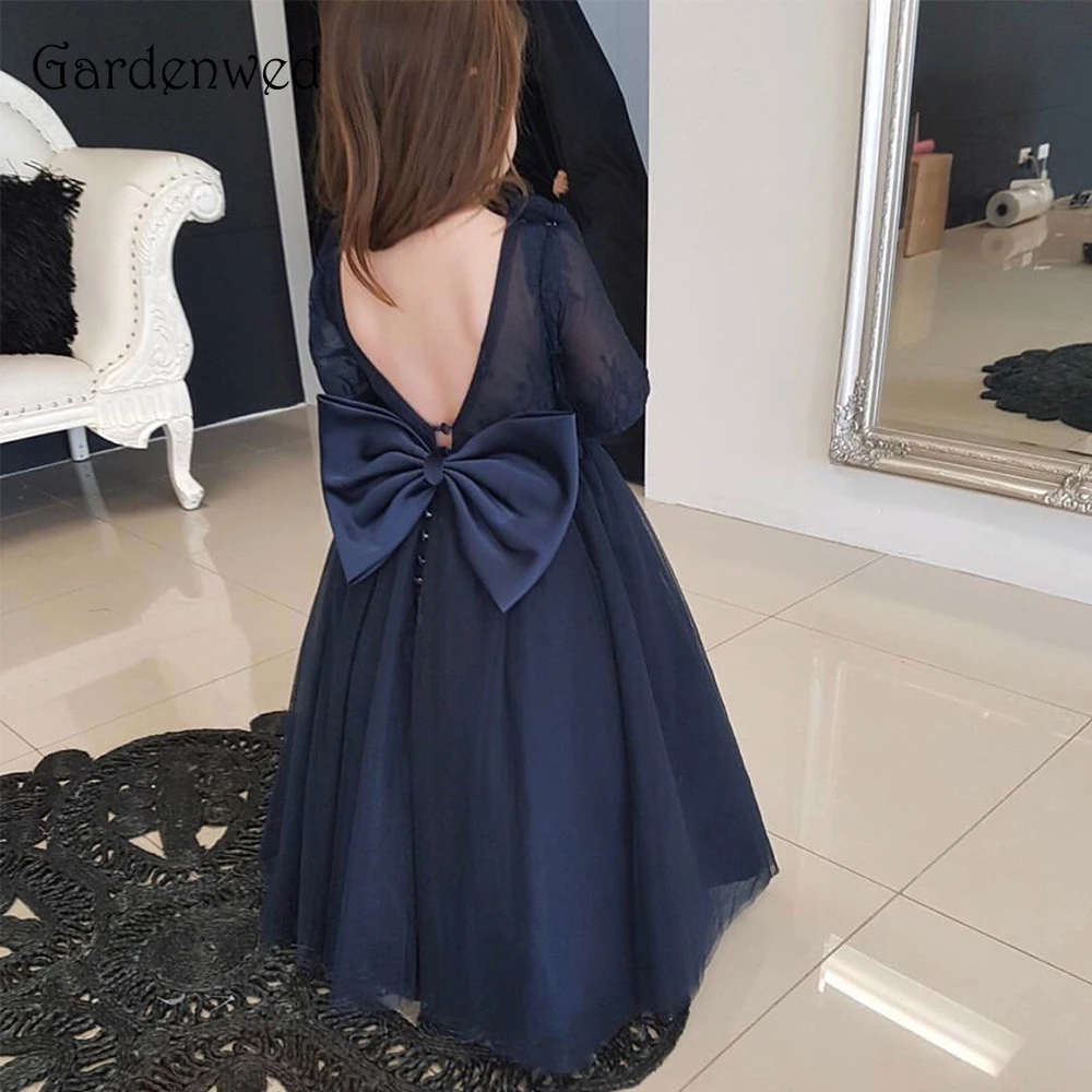 Платье для девочек с длинным рукавом и бантом на спине, темно-синее