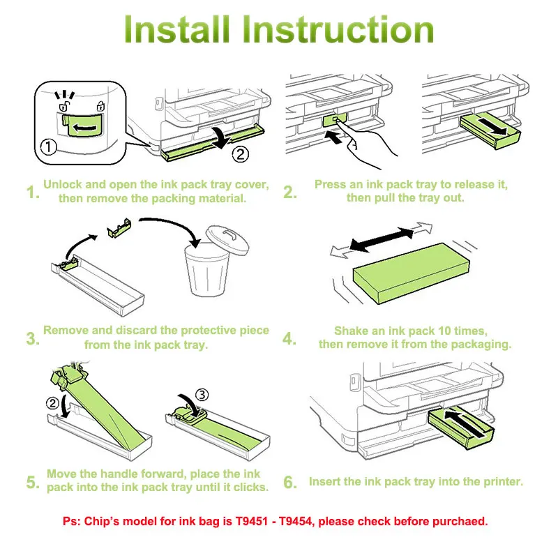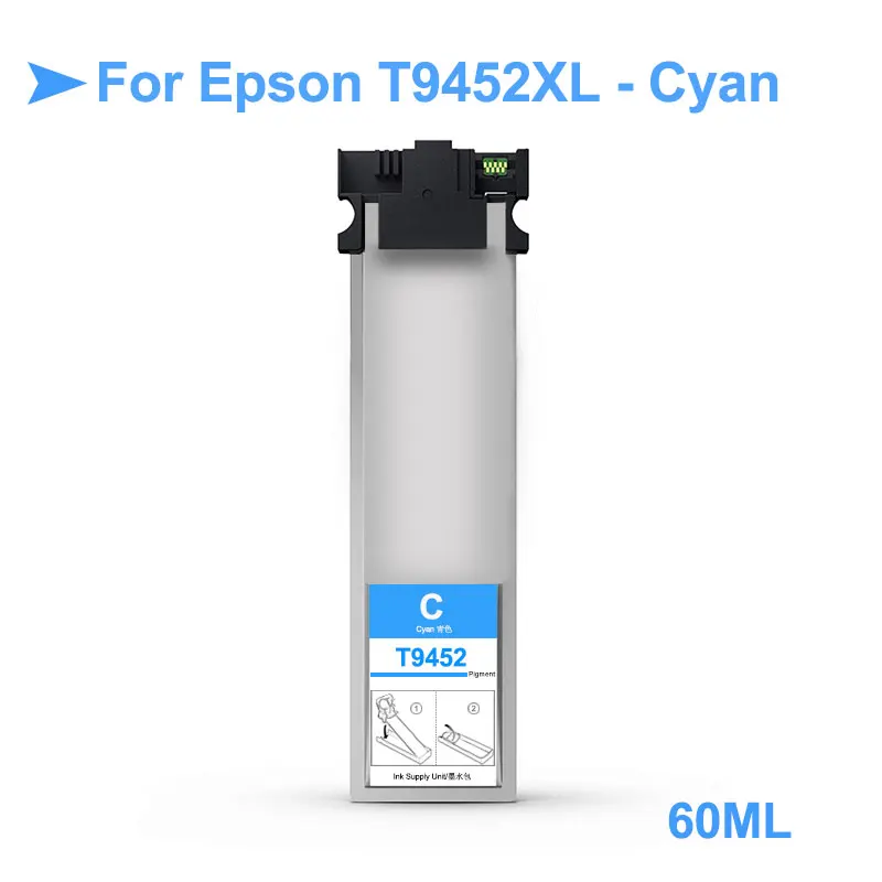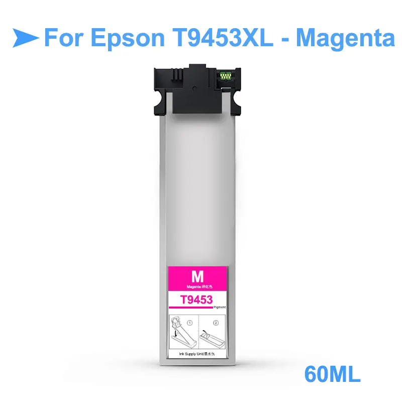 Особенности:1. Высокая производительность для доступной печати большого объема.Тот же объем с оригинальным объемом, сделать большие печати.2. Быстросохнущие пигментные чернила предназначены для высокоскоростных печатных работ.3.Острый текст для профессионального качества результатов.Есть вопросы?1. Какой тип этого мешка для чернил?Одноразовая микросхема и быстросохнущие пигментные чернила. Можно устанавливать и печатать напрямую.2. Какие Чернила внутри, хорошо ли они печатаются?Чернильный пакет заправляется быстрым dring, который sepelized для этой модели. Цена ниже, чемОригианл, в то время как хороший priting. Приносим больше затрат.3.Мой принтер Epson WF-C5290 / WF-C5790 / WF-C5210 / WF-C5710, но не может быть использован?Чип чернильного мешка T9451 / T9452 / T9453 / T9454, который используется в Европе. Соответствующий код OEM C13T945140 / C13T945240 / C13T945340 / C13T945440.Если чип отличается от нас, наш чернильный пакет не может использовать на вашем принтере даже модель принтера.