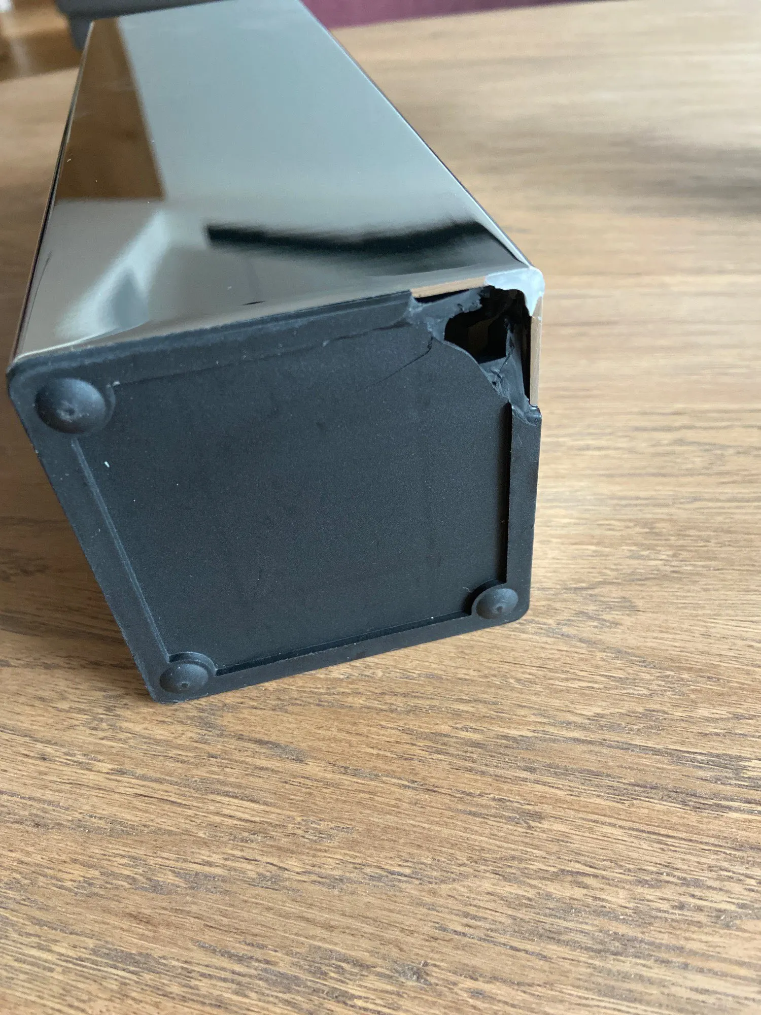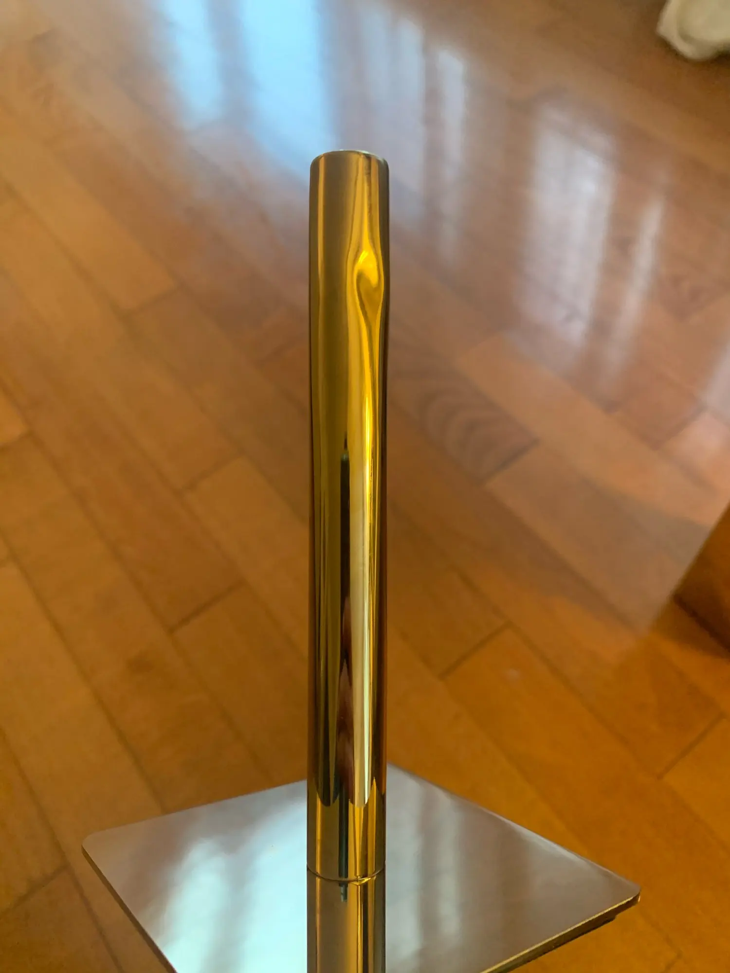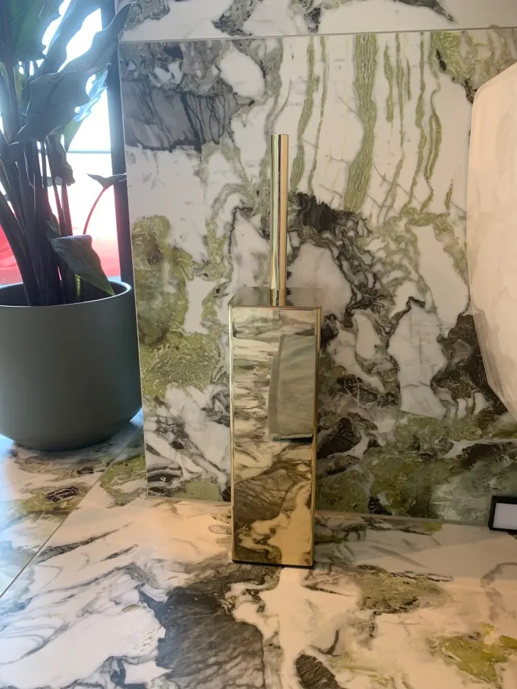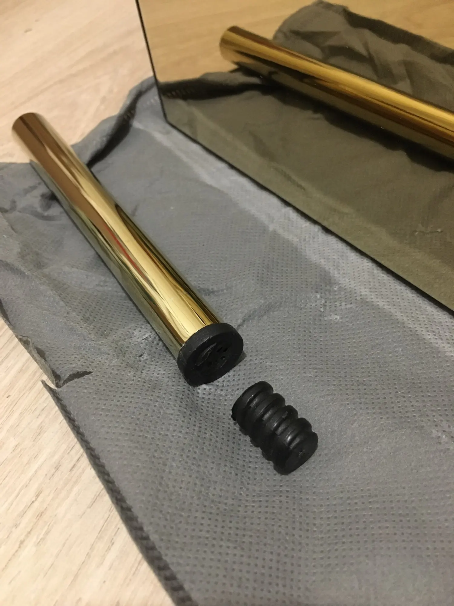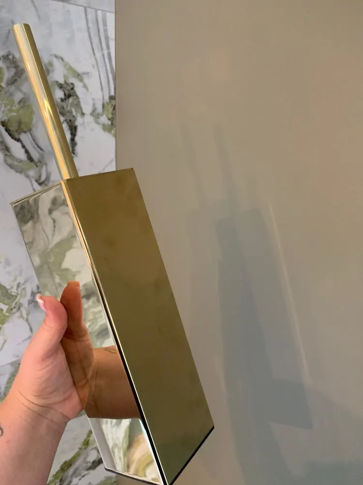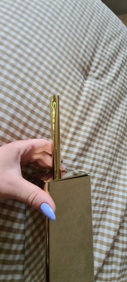 Хорошее качество, запасная щетка, внутри пластиковый контейнер, но ПОГНУТА верхняя часть ручки - над упаковкой нужно подумать продавцу. Вышлите, пожалуйста, верхнюю часть ручки и я дополню отзыв. Отпечатки пальцев остаются, но это с любым золотом так