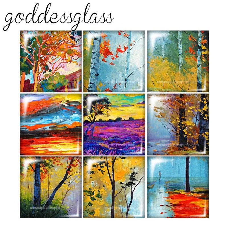 FB0315 картины маслом Пейзаж Деревья 10 шт. Смешанные 12 мм20 мм25 мм30 мм квадратные фото стекло кабошон демонстрация плоская задняя сторона