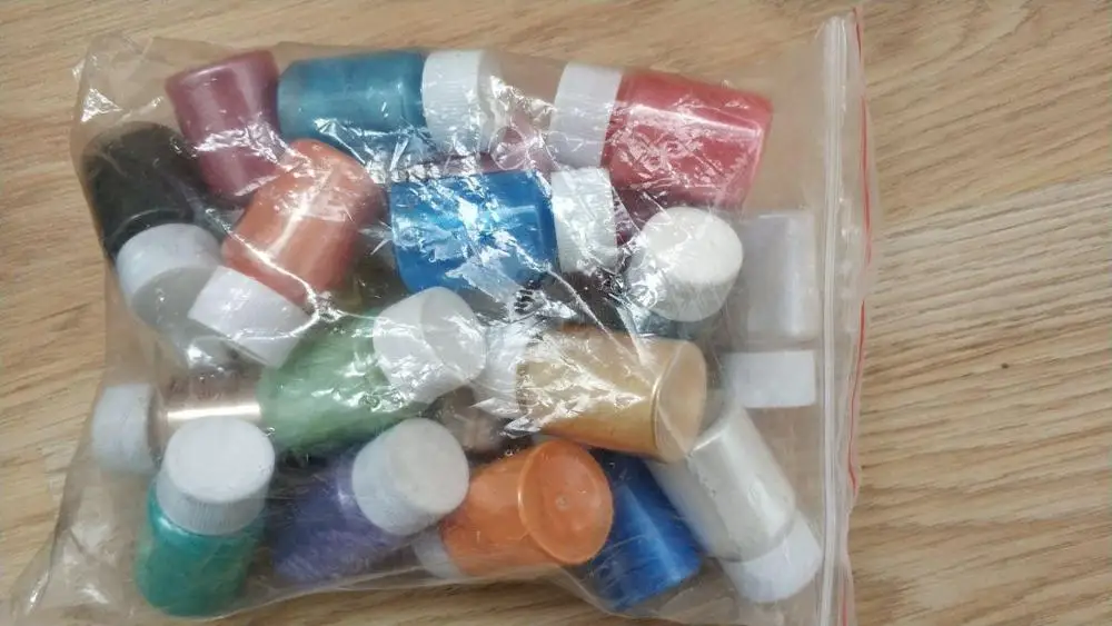 Заказ в Москве получила где-то через месяц (прямо если считать с даты размещения заказа до получения на почте). Пигменты были в пакете, но ничего не побилось и не помялось. Почему-то некоторые баночки были с защитной плёнкой на горлышке, а некоторые - без (см.фто). Цветами очень довольна, они насыщенный, очень красивый перламутр! На фото подстаканники делала с этими пигментами, но они получились тусклее, чем на самом деле. Для яркого цвета нужно не очень много, баночки довольно большие, так что хватит надолго.