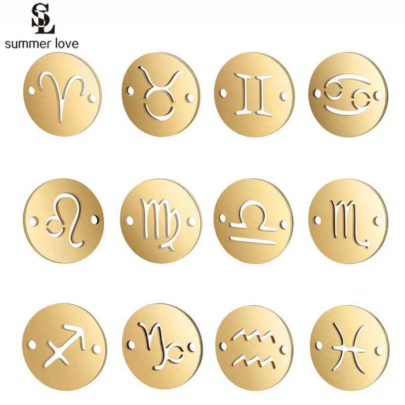 Подвески из нержавеющей стали с созвездиями зодиака для изготовления ювелирных изделий своими руками, Круглый диск 12 мм, соединители с 2 отверстиями, подвеска для браслета, 10 шт.