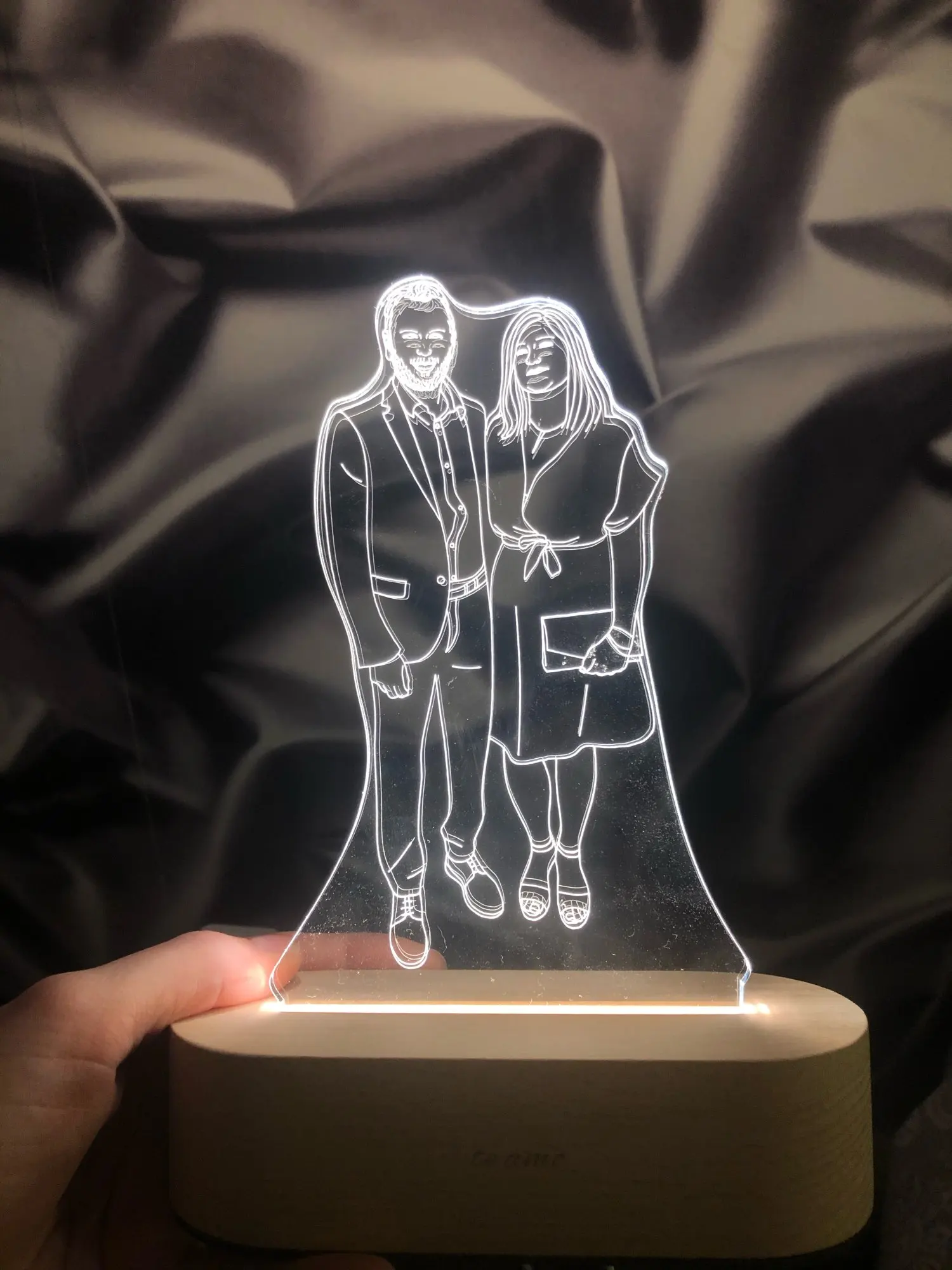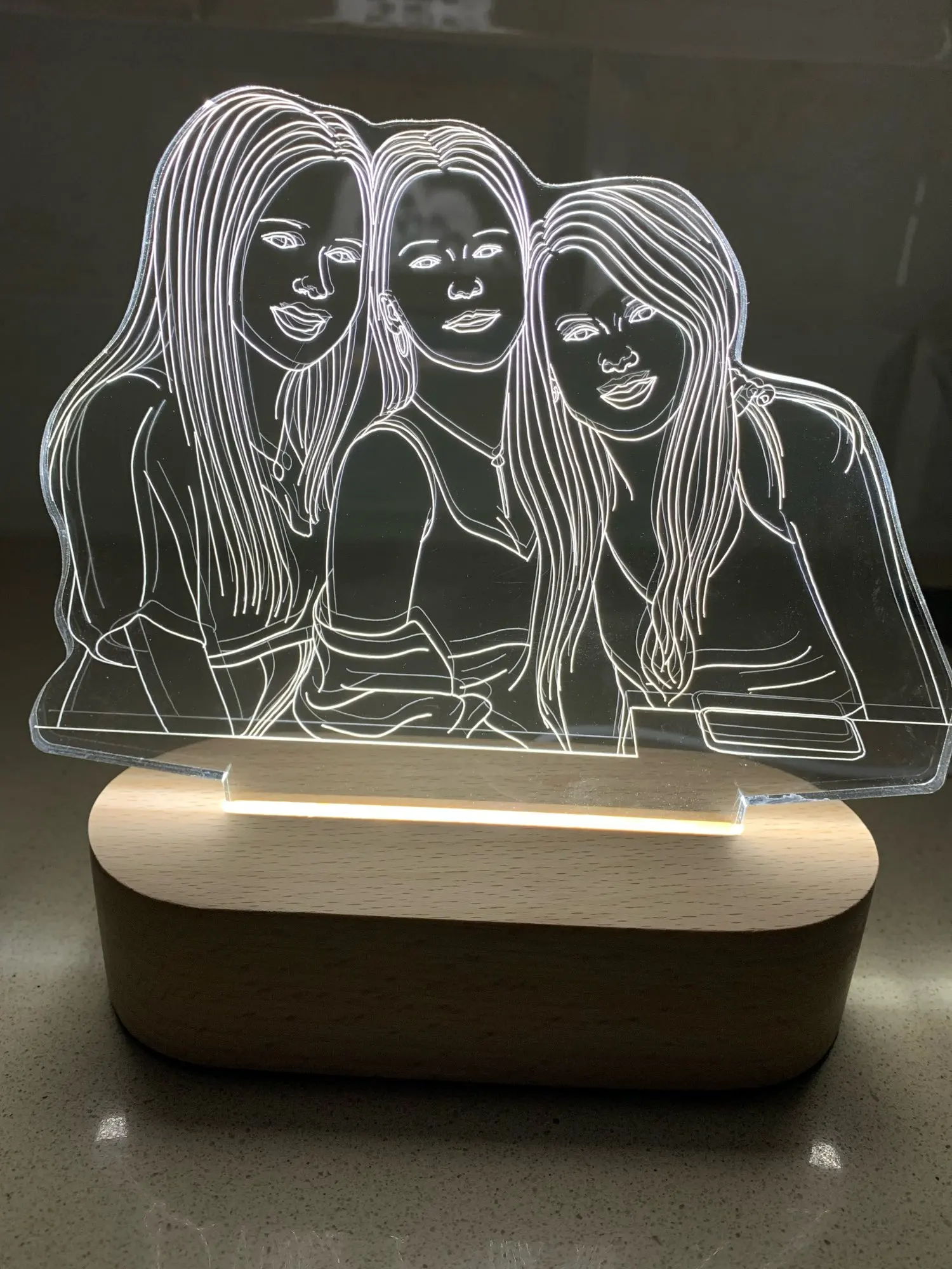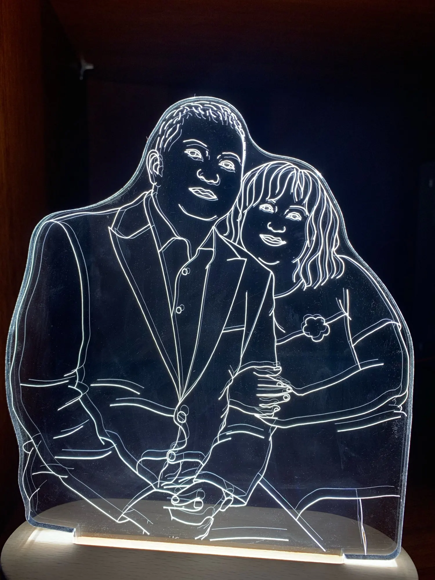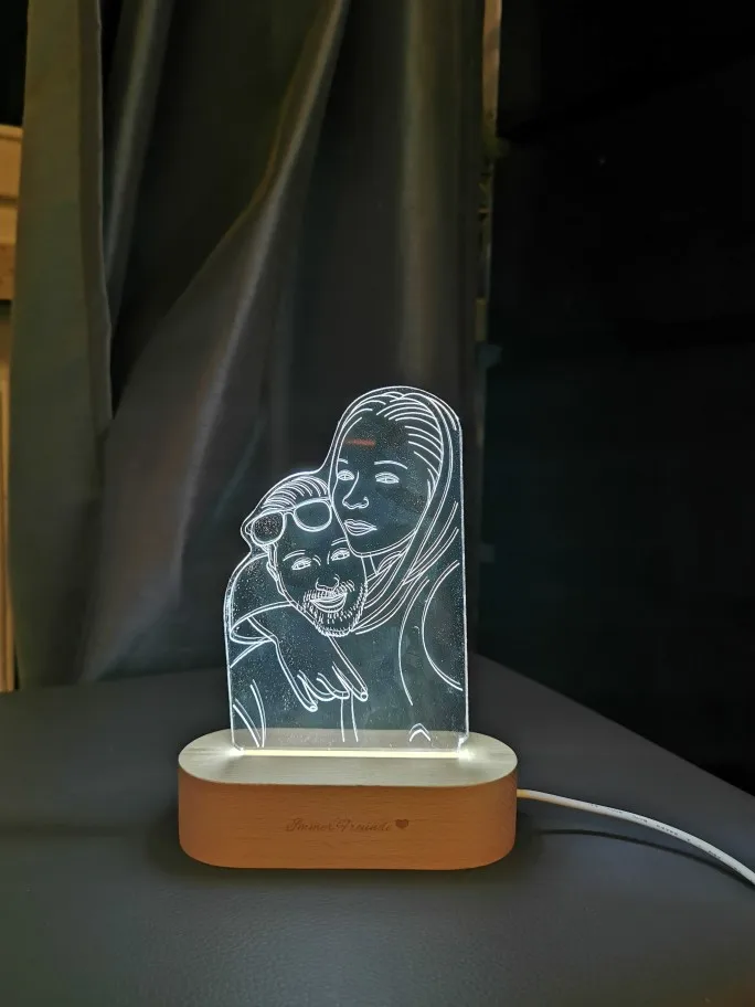 Очень круто выглядит. Заказывала в подарок своему молодому человеку. Мы с ним в восторге. Яркость можно настроить, как и цвет освещения. Гравировка выполнена красиво и аккуратно, без ошибок. Боялась, что лица не будут похожи, но нет! Всё четко!