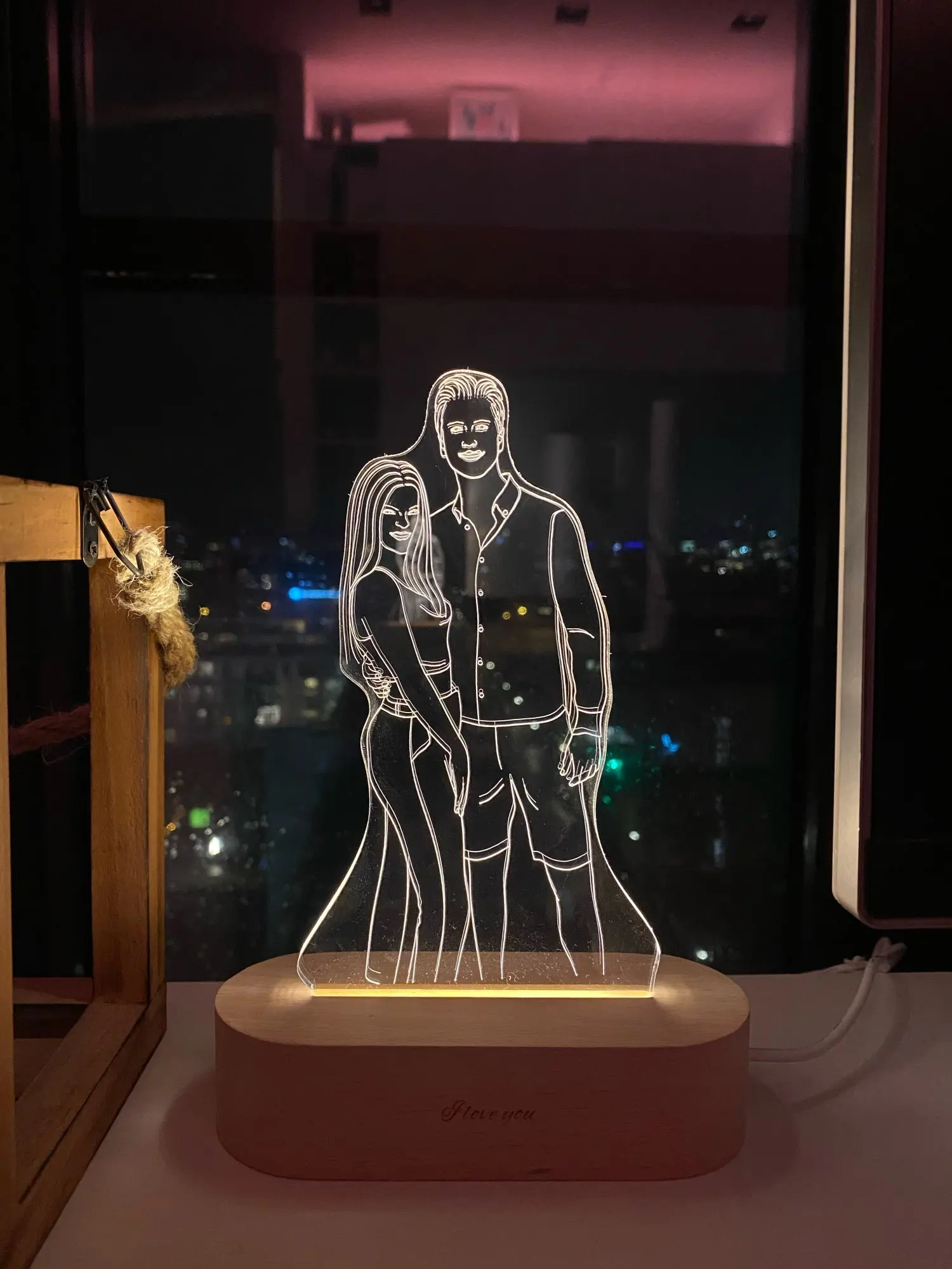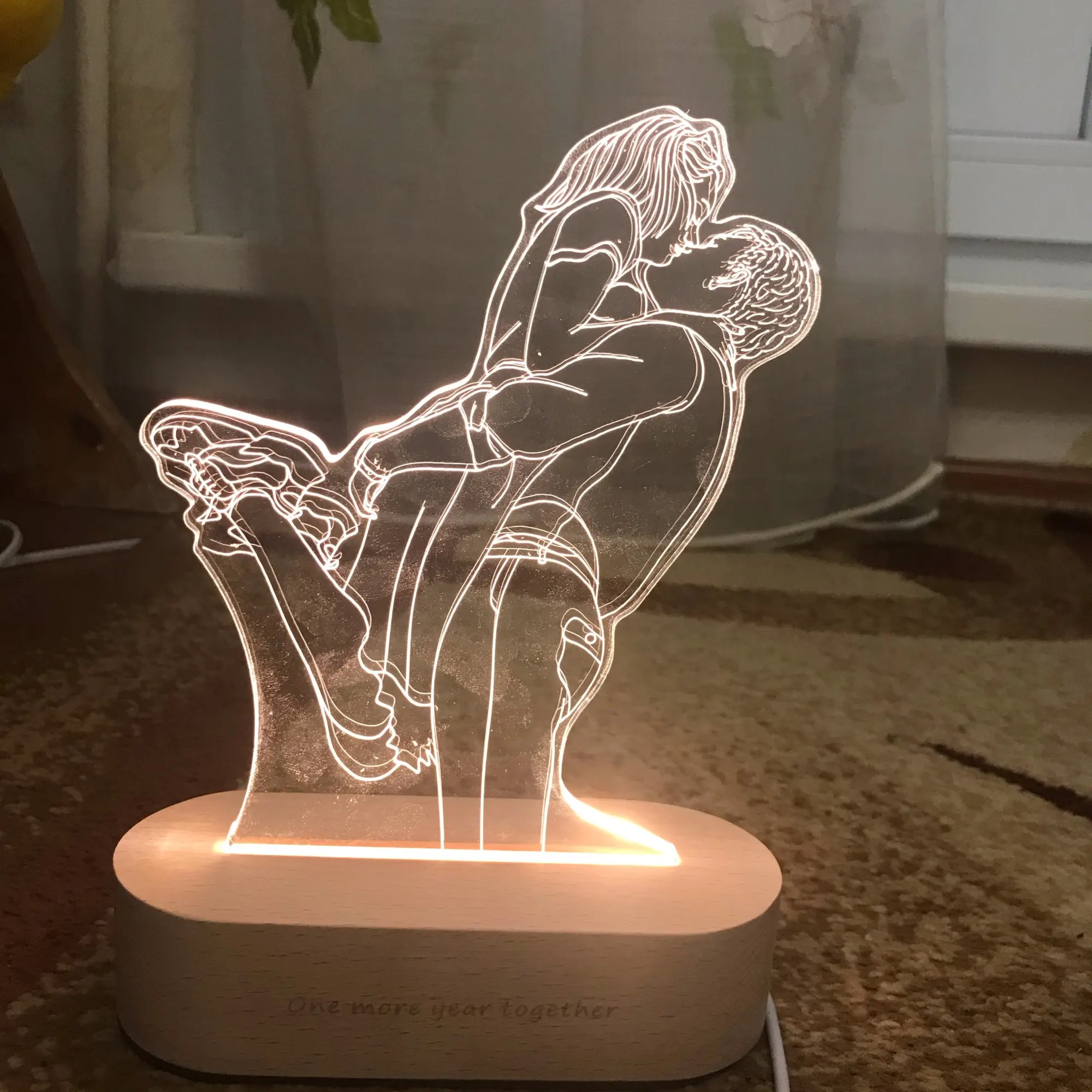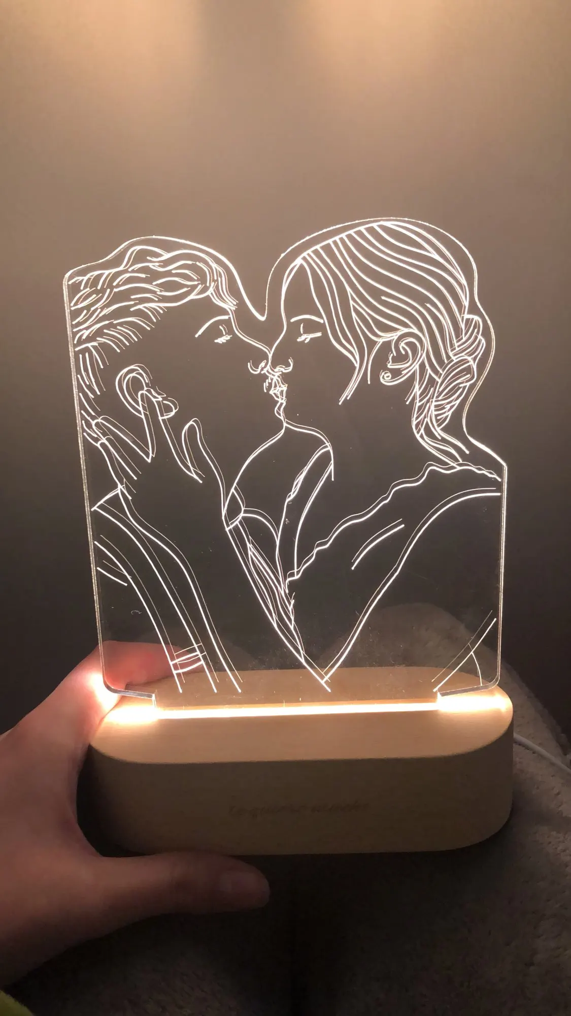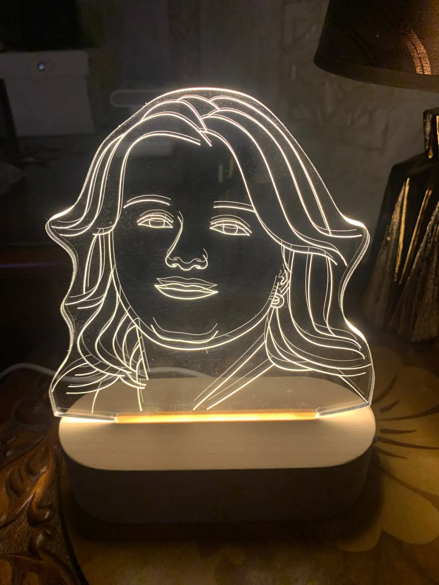 Очень круто выглядит. Заказывала в подарок своему молодому человеку. Мы с ним в восторге. Яркость можно настроить, как и цвет освещения. Гравировка выполнена красиво и аккуратно, без ошибок. Боялась, что лица не будут похожи, но нет! Всё четко!