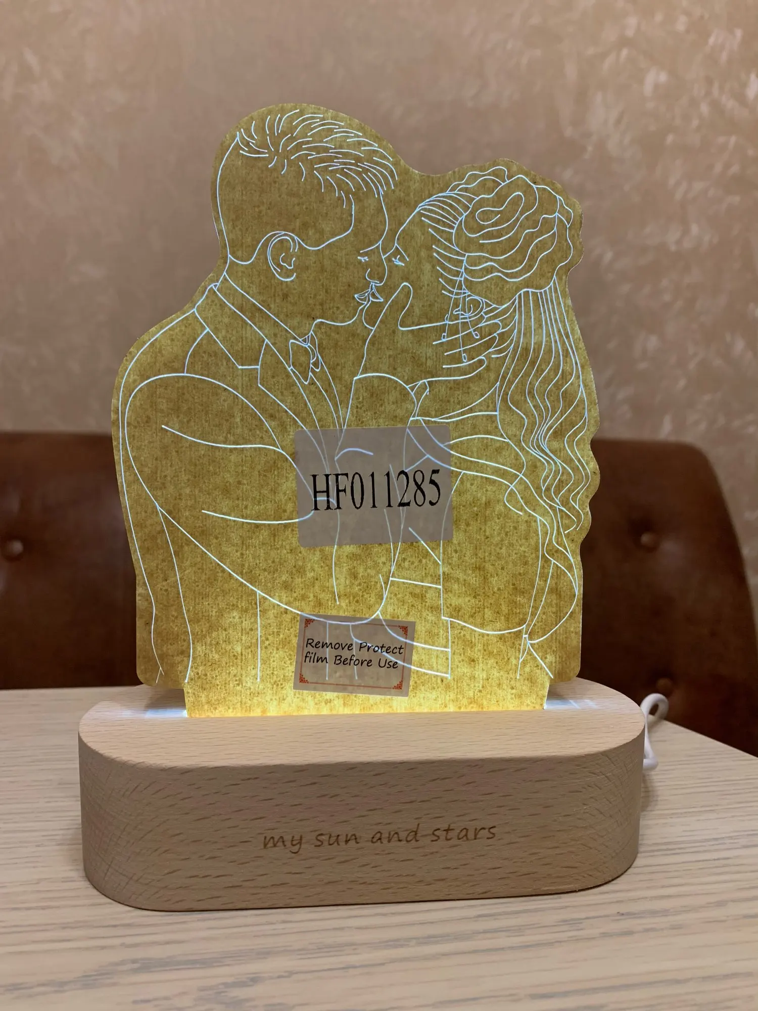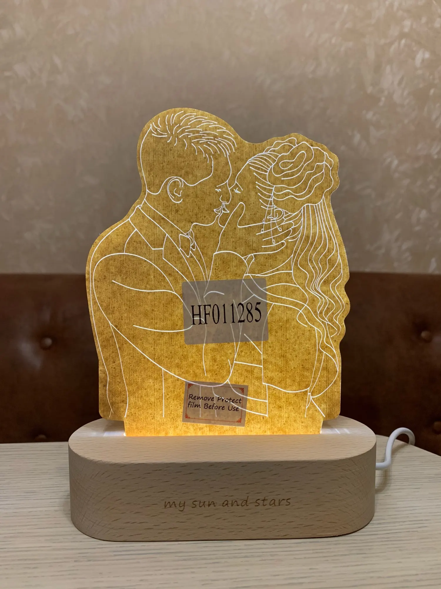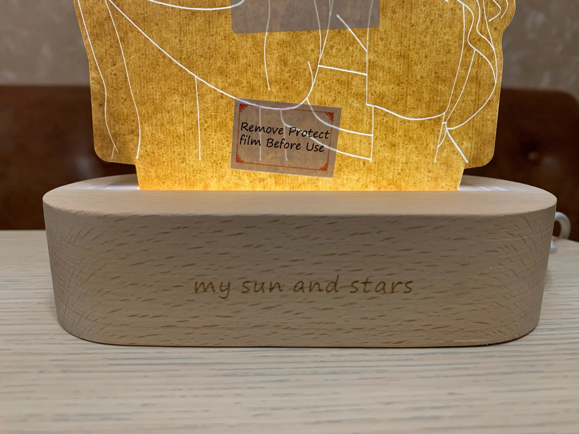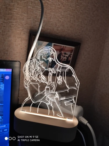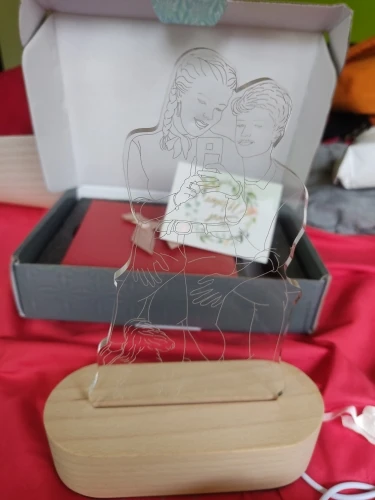 Результатом довольна! Светильник пришёл целый, надпись была оформлена, как и договаривались. Подсветка по яркости регулируется и у меня еще меняет пару оттенков цветов. Прилагается еще маленький кармашек-конвертик, где мини-открытка, которую можно подписать, если этот светильник в подарок. Есть минус! На рамке были 2 наклейки, одна с какой-то надписью на англ. яз., другая типа с кодом или артикулом. Надпись оторвалась легко. А вторая наклейка с трудом отошла, и оставила след на изделии, прямо на людях, так сказать. Хорошо, что не на лицах. Когда светится, то не видно дефекта, но когда теперь люди откроют подарок, то увидят, что там косячок!!!