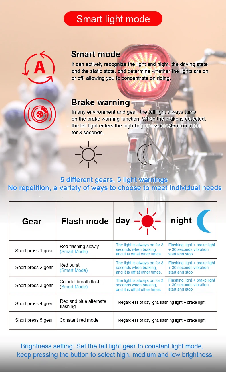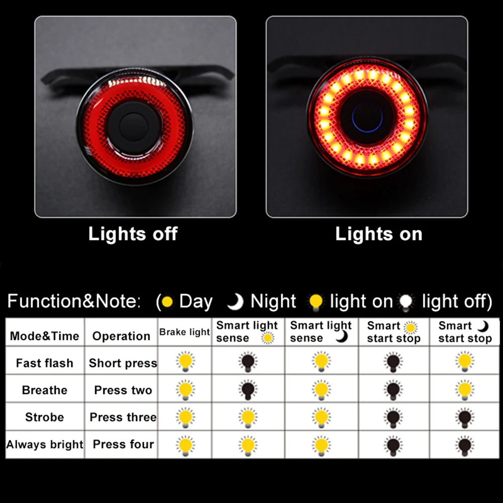 Хорошее качество. Его работа выглядит следующим образом. 1 Режим: мерцание, которое выключается в течение 30 секунд. 2 режима: «дышащий» тип света, который также выключается в течение 30 секунд. 3 режима: двойное мигание, которое не выключается. 4 режима: фиксированный свет, который также не выключается. В любом случае, обнаружив, что он тормозит велосипед, свет фиксируется в течение нескольких секунд и с более высокой интенсивностью. Если мы встретим в режимах 1 и 2, в течение 30 секунд свет выключится, пока не обнаружится, что он остановлен.