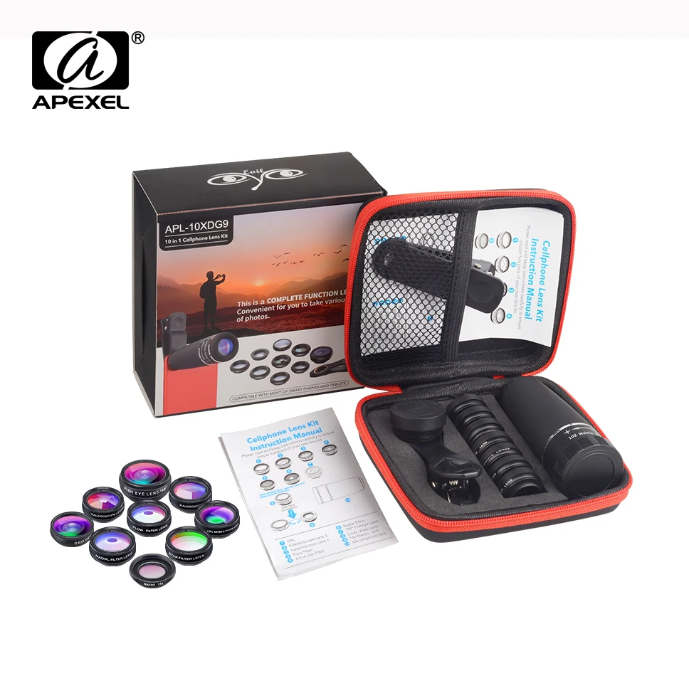 Набор объективов APEXEL 10 в 1, набор объективов для камеры телефона, объектив рыбий глаз, широкоугольный макрофильтр, Звездный фильтр, Объективы CPL для смартфона iPhone 11 Samsung Redmi