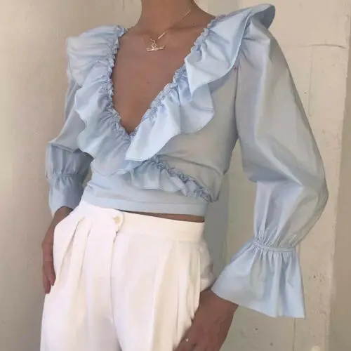 Блузка женская шифоновая, с длинными рукавами-фонариками, открытыми плечами, Короткие топы Блузы