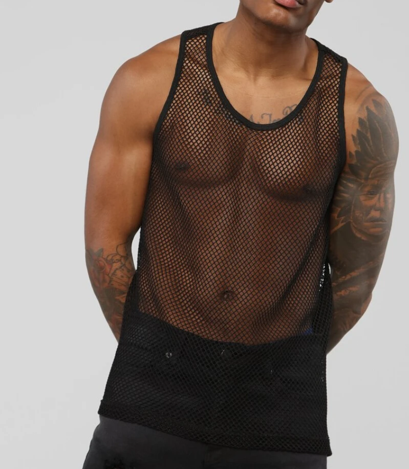Сексуальная мужская сетчатая прозрачная в крупную сетку майка для спортзала облегающая Клубная одежда Нижнее белье