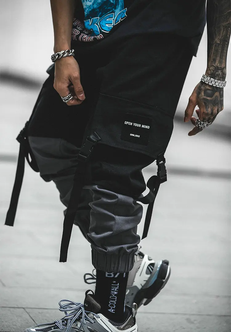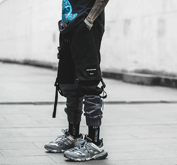 Прямая поставка, хлопковые брюки-карго Pachwork, 2022, уличная одежда, хип-хоп, с лентами, брюки-джоггеры, мужские брюки в Корейском стиле, черные повседневные тренировочные штаны