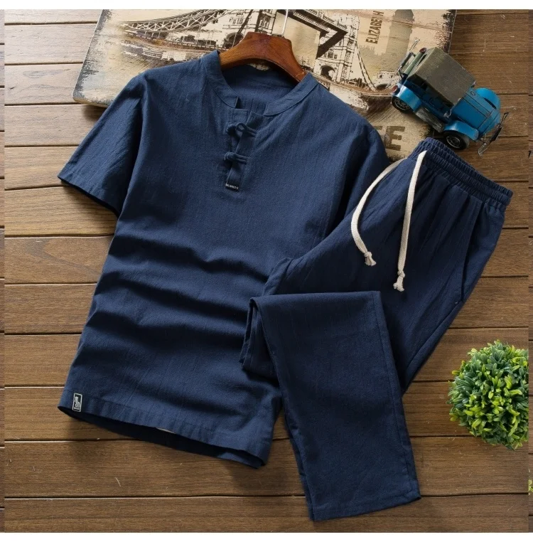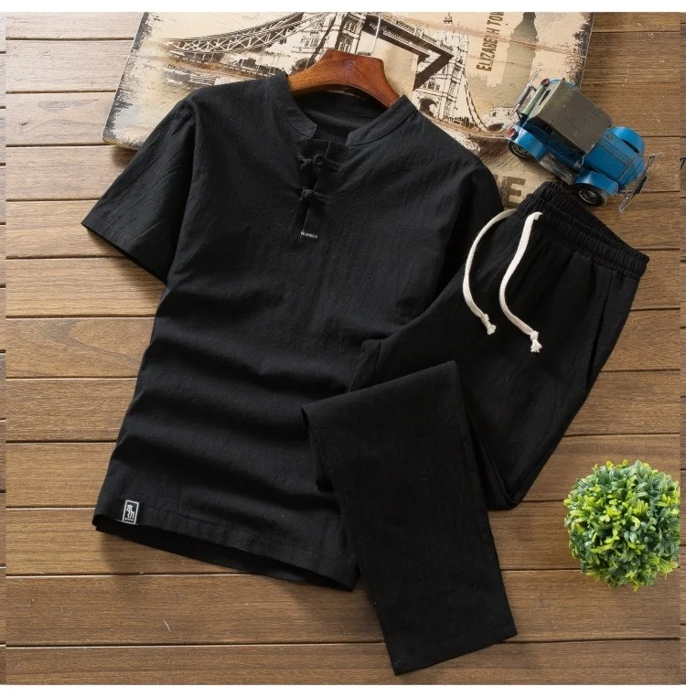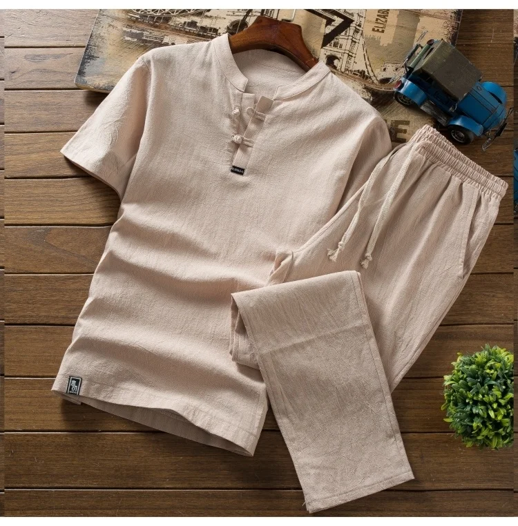 Мужские летние удобные комплекты из натурального хлопка и льна, тонкая футболка + штаны, Мужская свободная дышащая рубашка + брюки, размер M-5XL