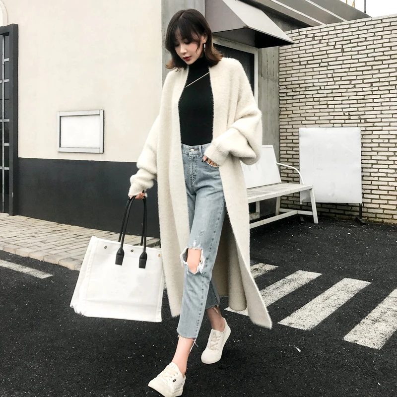 Женский зимний свободный свитер из искусственной норки и вельвета, женский теплый вязаный шерстяной кардиган оверсайз, длинное меховое пальто