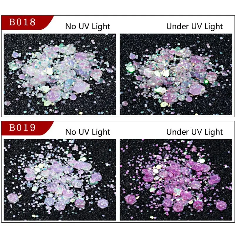 Характеристика: Потрясающие солнечные лучи реактивные блестки, разные цвета-красный, оранжевый, желтый, фуксия, синий, индиго, фиолетовый. Поначалу они просвечиваются, но выводят их в светильник и волшебно меняют их от чистого до красочного. Их нужно положить под ультрафиолет, затем они превращаются в разные цвета. Идеально подходит для детского творчества и рукоделия; Подходит для изготовления ювелирных изделий, содержит сообщение на ожерелье или браслете. Спецификация: Материал: Солнечный свет реактивные блестки Цвет: 1 #2 #3 #4 #5 #6 #7 #8 # Размер: 1 г одна бутылка, Количество: 1 бутылка