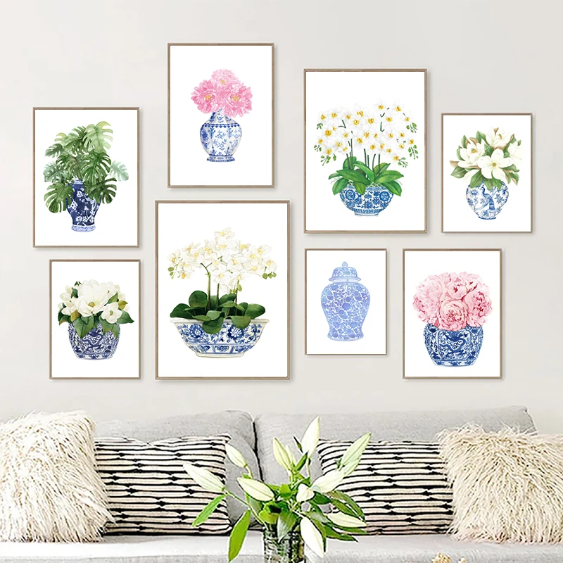 Синий и белый Китай Магнолия Гортензия печать китайское искусство холст живопись галерея Настенная картина постер модный Настенный декор