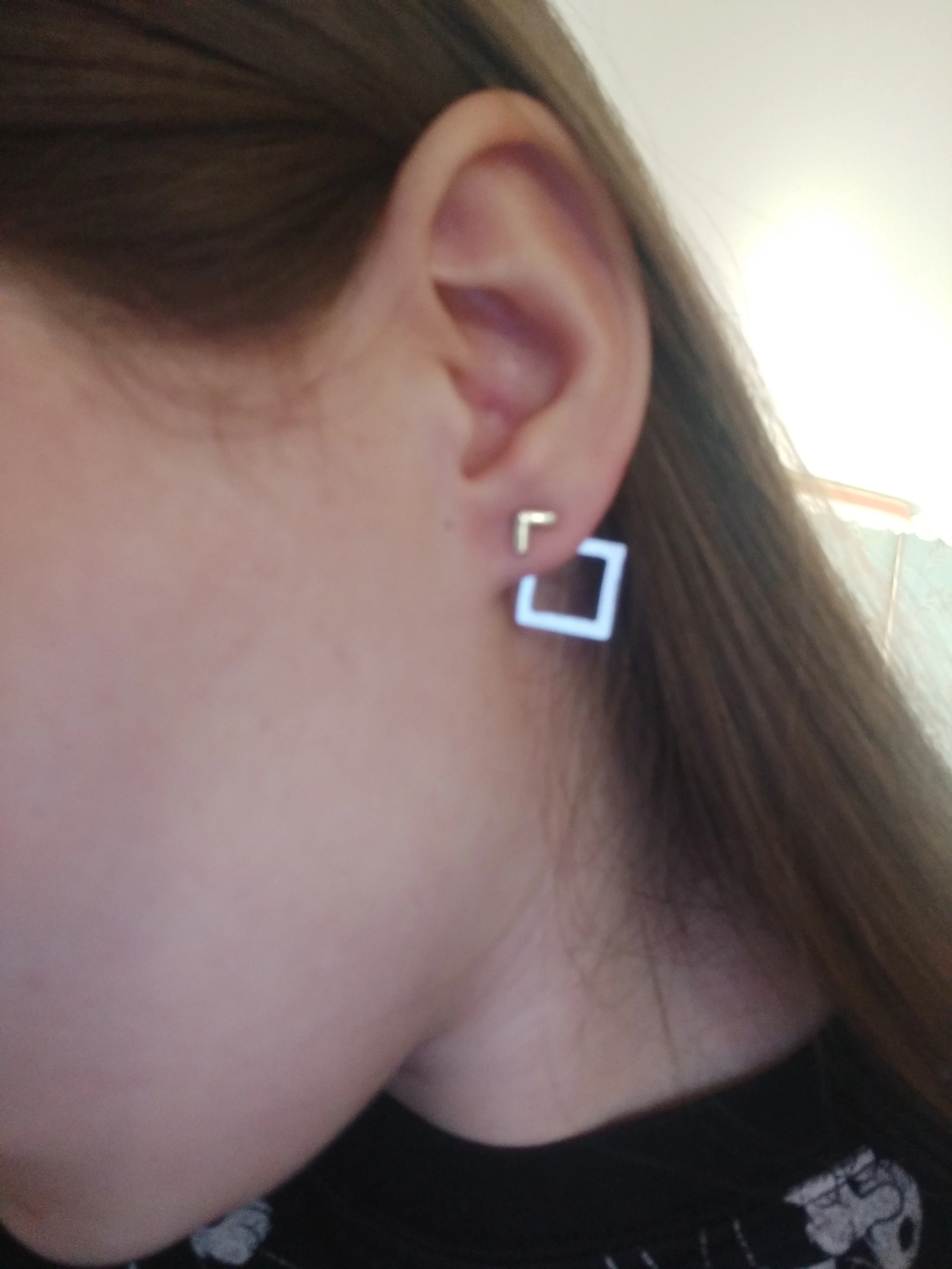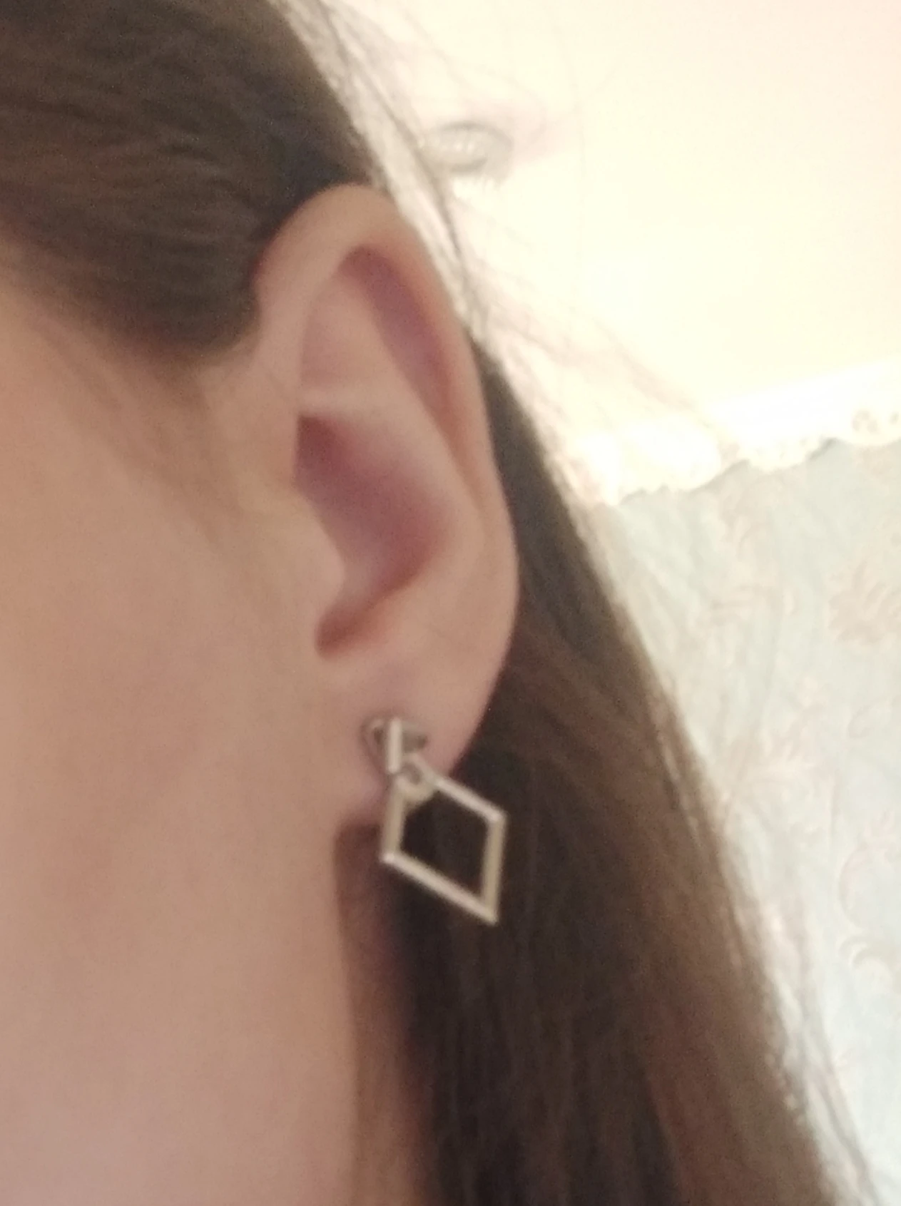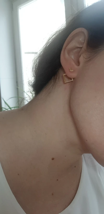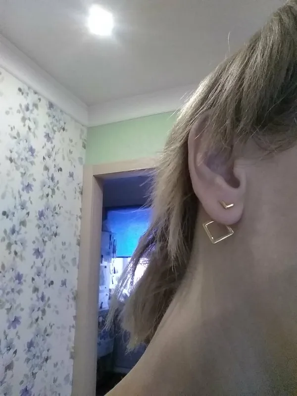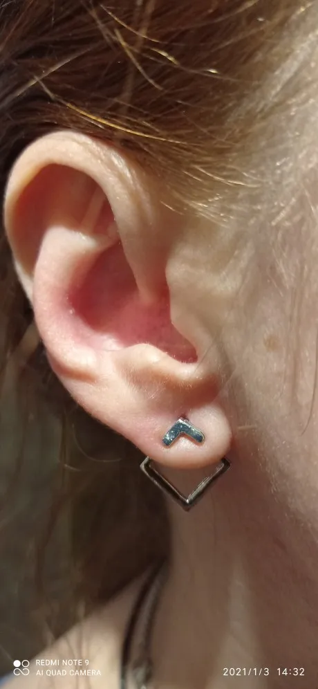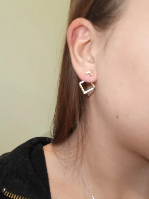 В отличие от другой пары сережек у этого продавца, эти вполне оправдали ожидания! Состоят из 3 частей,непросто надеть (на фото видно красную мочку уха) но приноровиться можно. Очень миниатюрные,аккуратные. Можно надевать уголком в разные стороны. Идеальная бижутерия за 38 рублей.