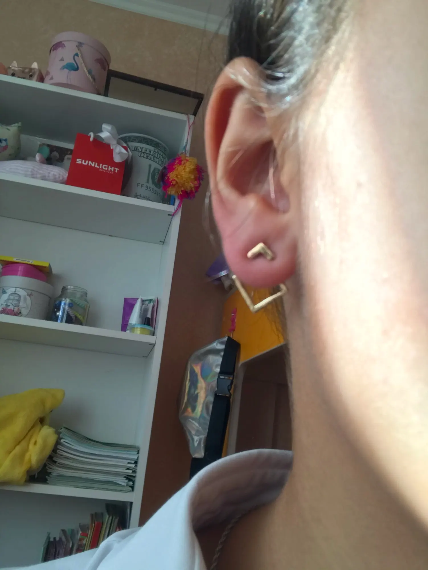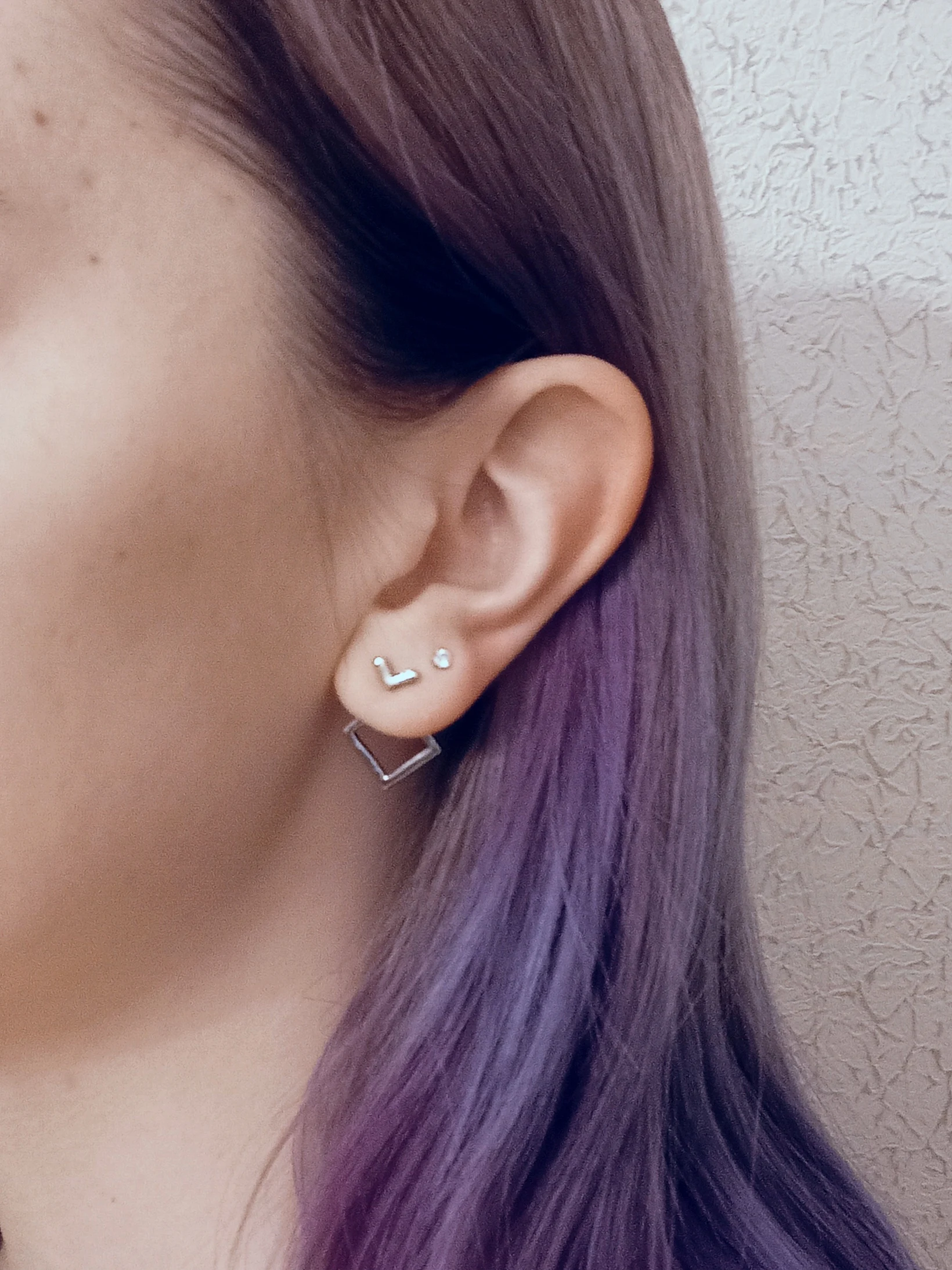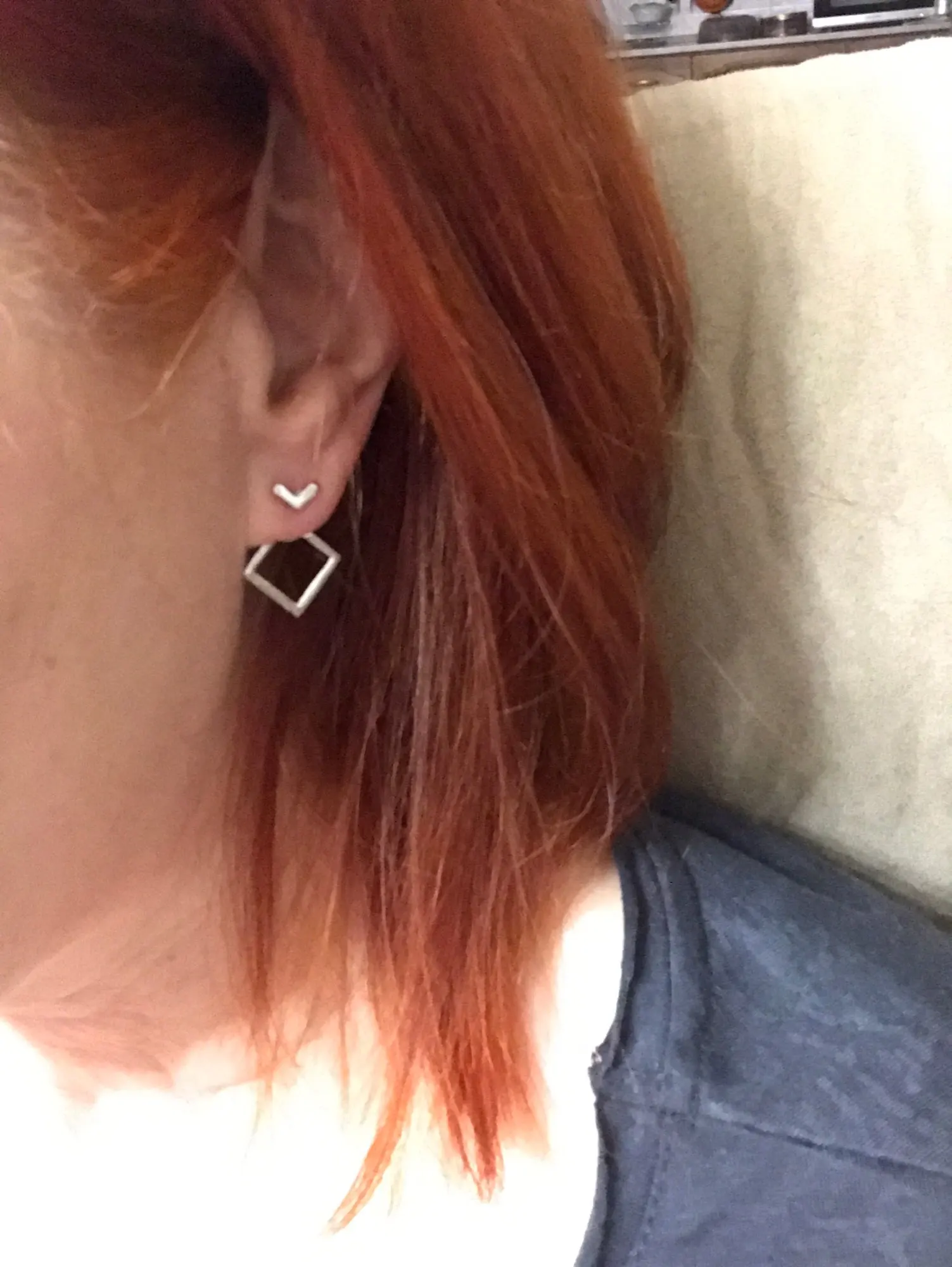 В отличие от другой пары сережек у этого продавца, эти вполне оправдали ожидания! Состоят из 3 частей,непросто надеть (на фото видно красную мочку уха) но приноровиться можно. Очень миниатюрные,аккуратные. Можно надевать уголком в разные стороны. Идеальная бижутерия за 38 рублей.