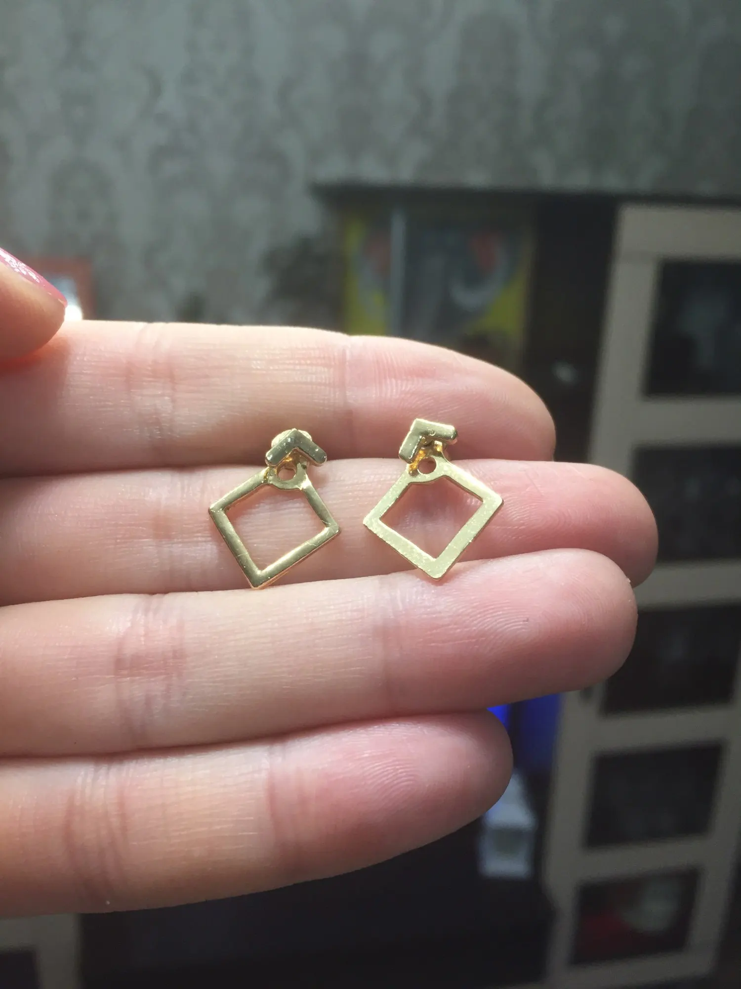 Как говорится «простенько, но со вкусом». Не массивные, идеальны на каждый день. Серьги состоят из трёх частей (передняя (гвоздик), задняя (висячий ромбик) и застежка). Выглядят очень даже достойно)