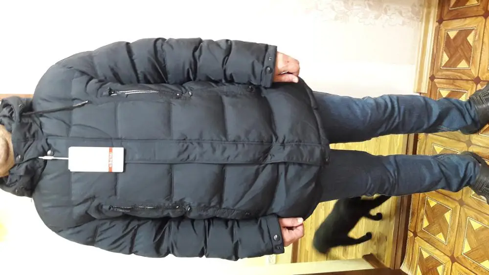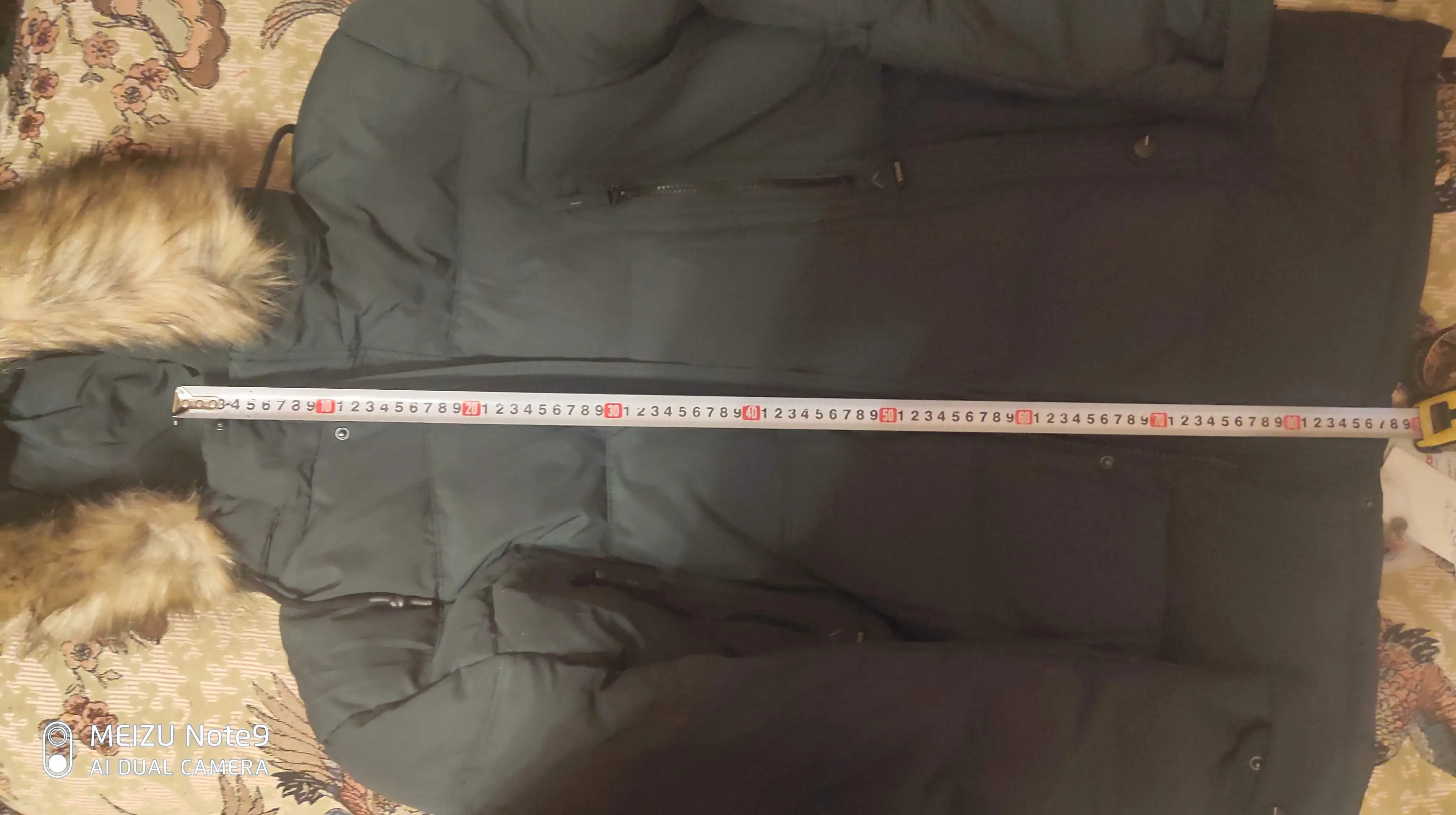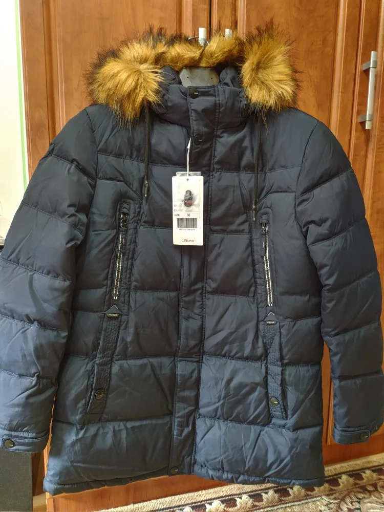 Хорошая фабричная куртка, цвет не чёрный, а с синим оттенком, красивый. На рост 180 см прикрывает попу, внизу куртки есть утяжка. Капюшон отстегивается, мех также отстегивается. Рукава длинные. На параметры 110-110(живот)-112 взяли 56-й размер. Есть запас для свитера. Доставка СДЭК в этот раз подкачала-из Москвы вместо 10 дней ехало 3 недели.