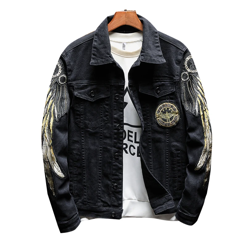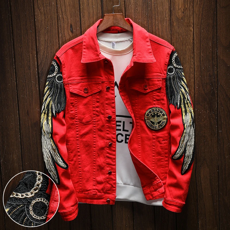 Куртка джинсовая с вышивкой крыльев, модная дизайнерская приталенная Мужская короткая куртка из денима, черная, красная, большие размеры, 2019