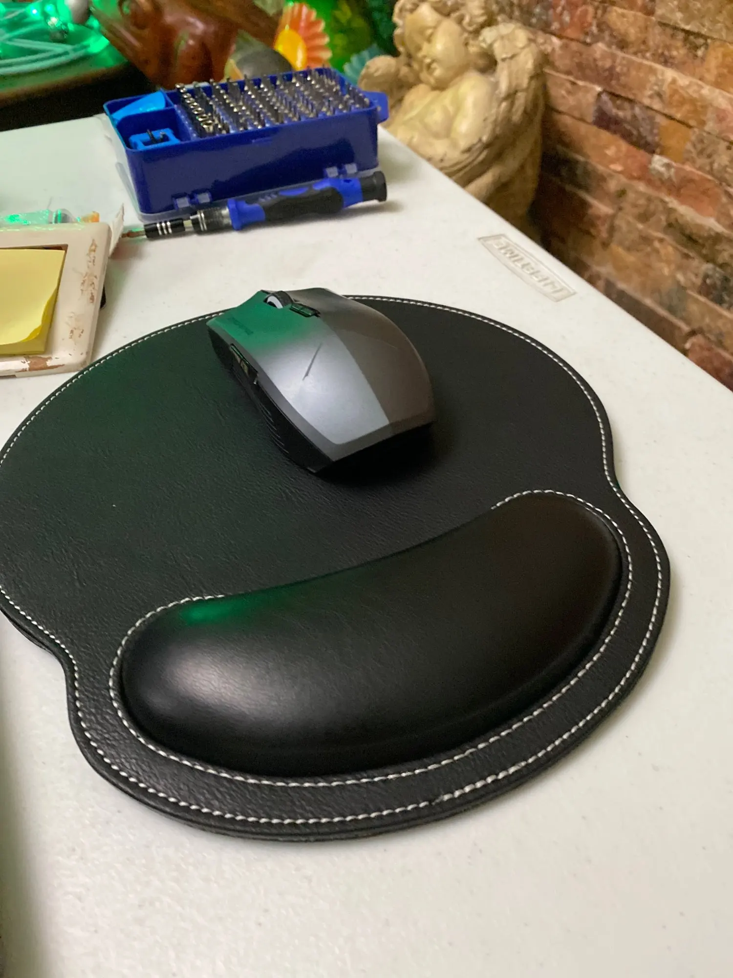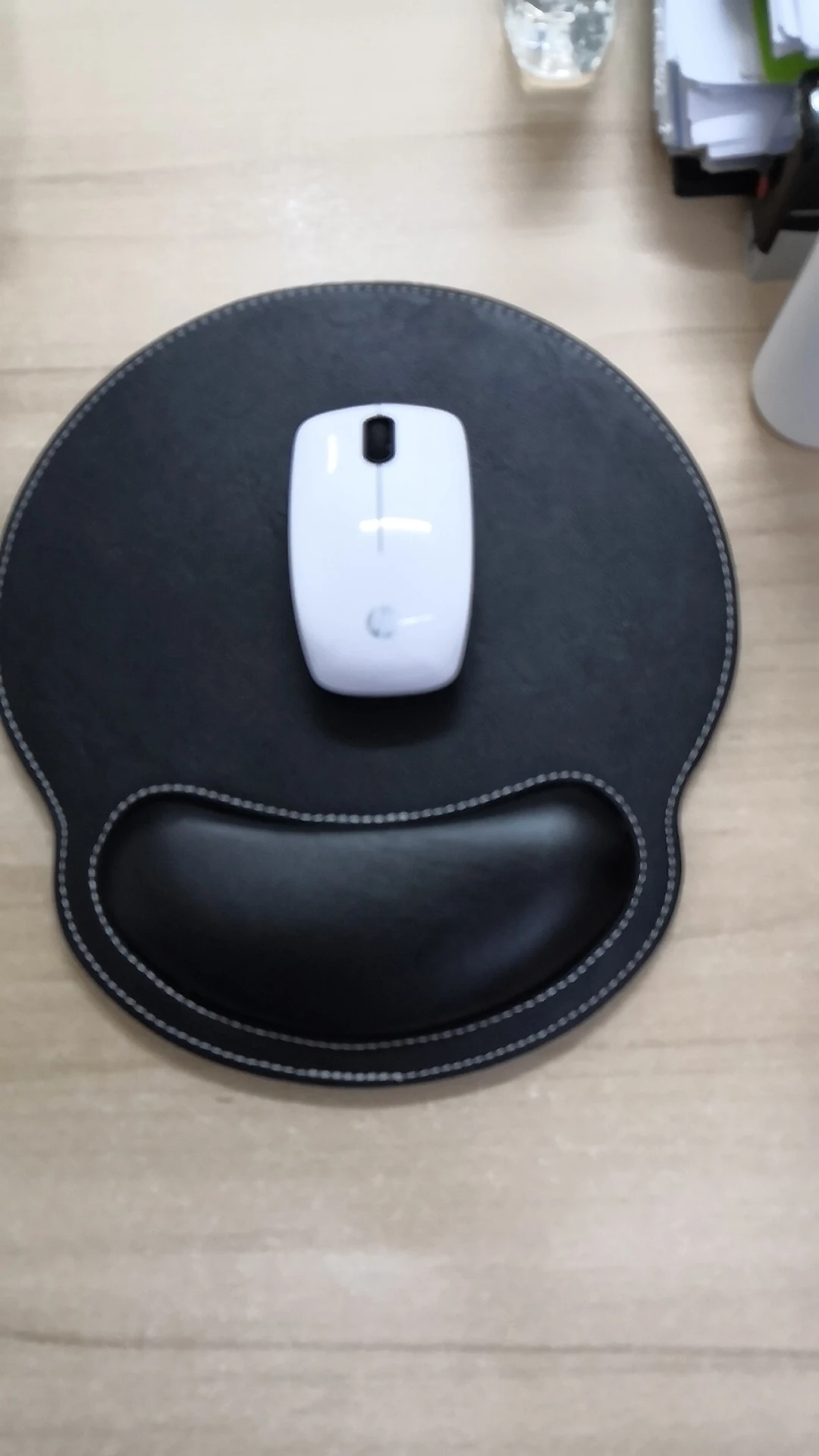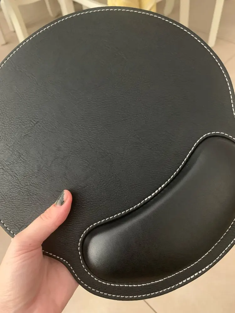 Очень красивый коврик для мыши. Хорошая отделка. Очень удобная подставка для запястья. Я не жалею о своей покупке