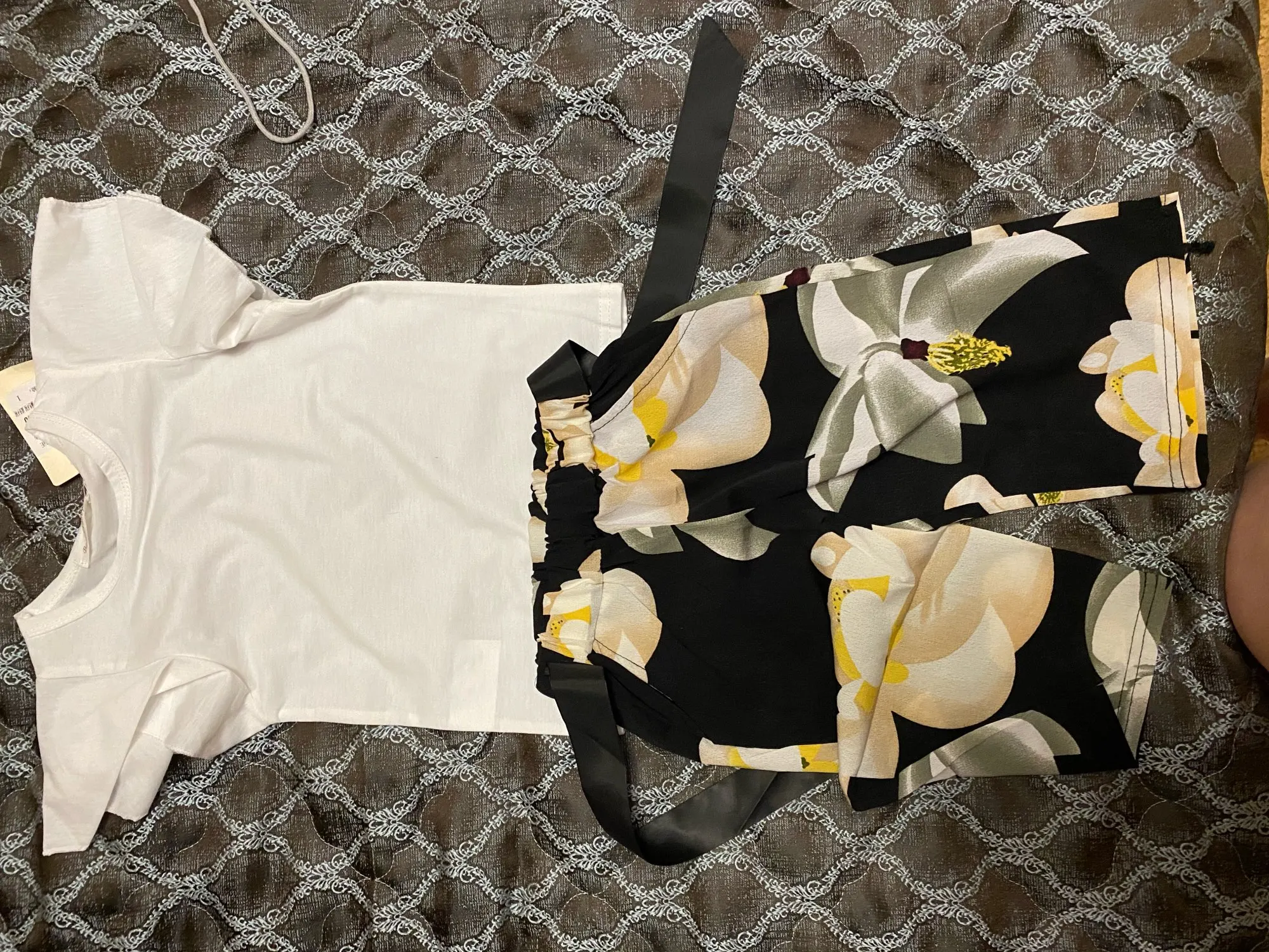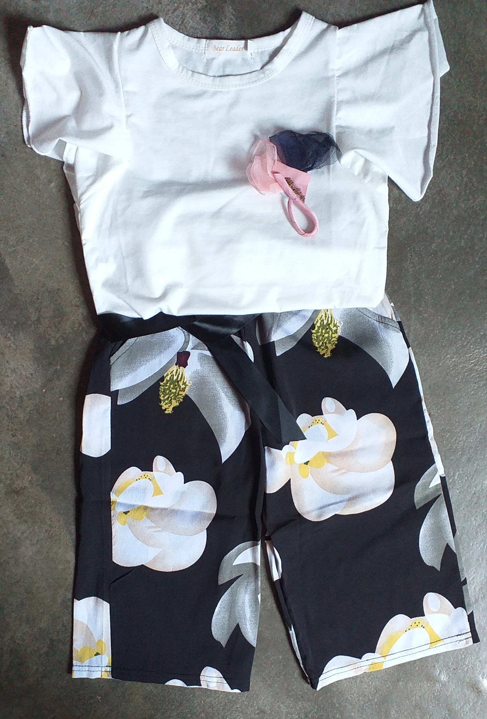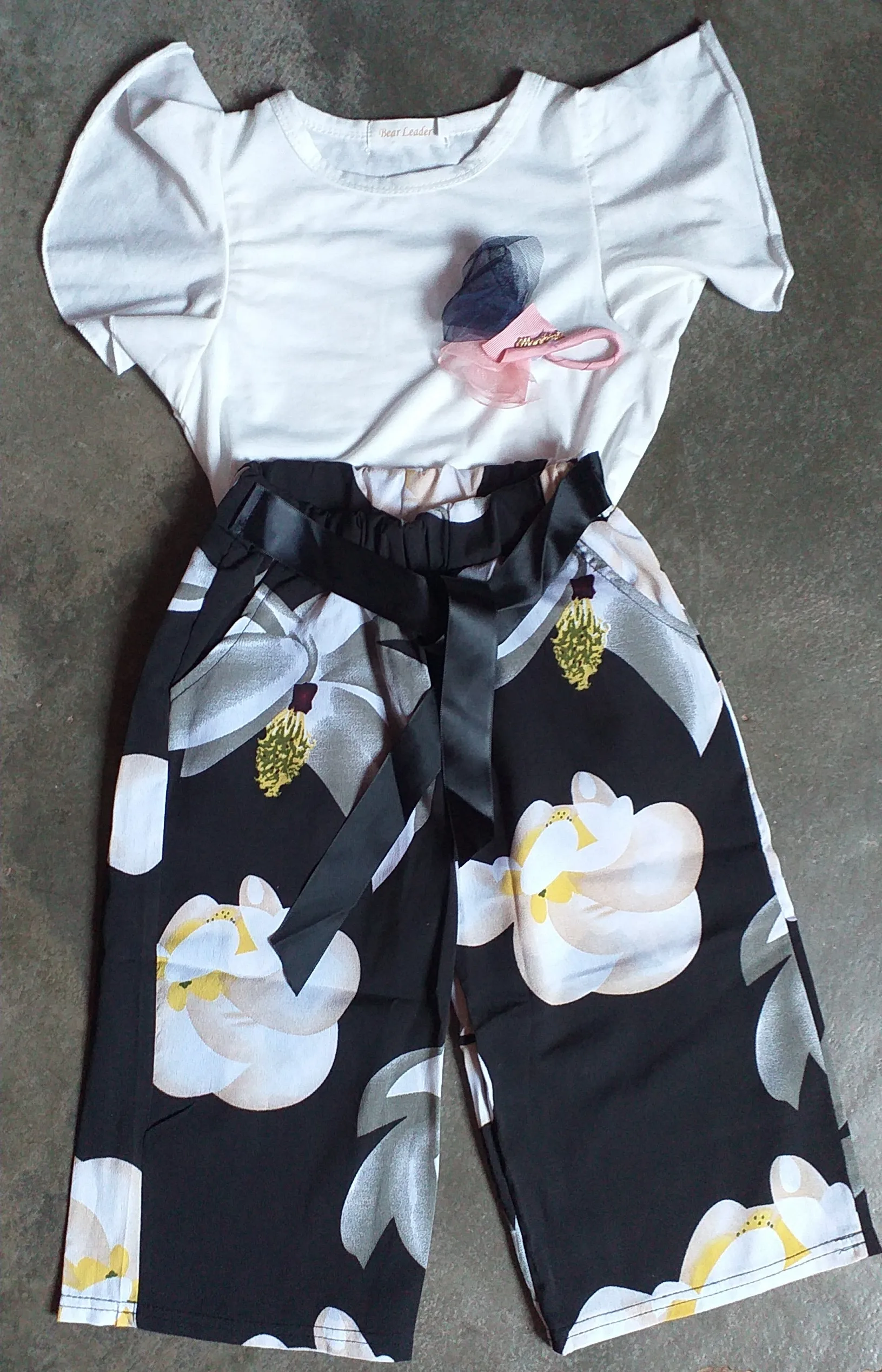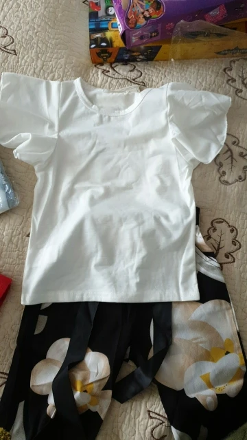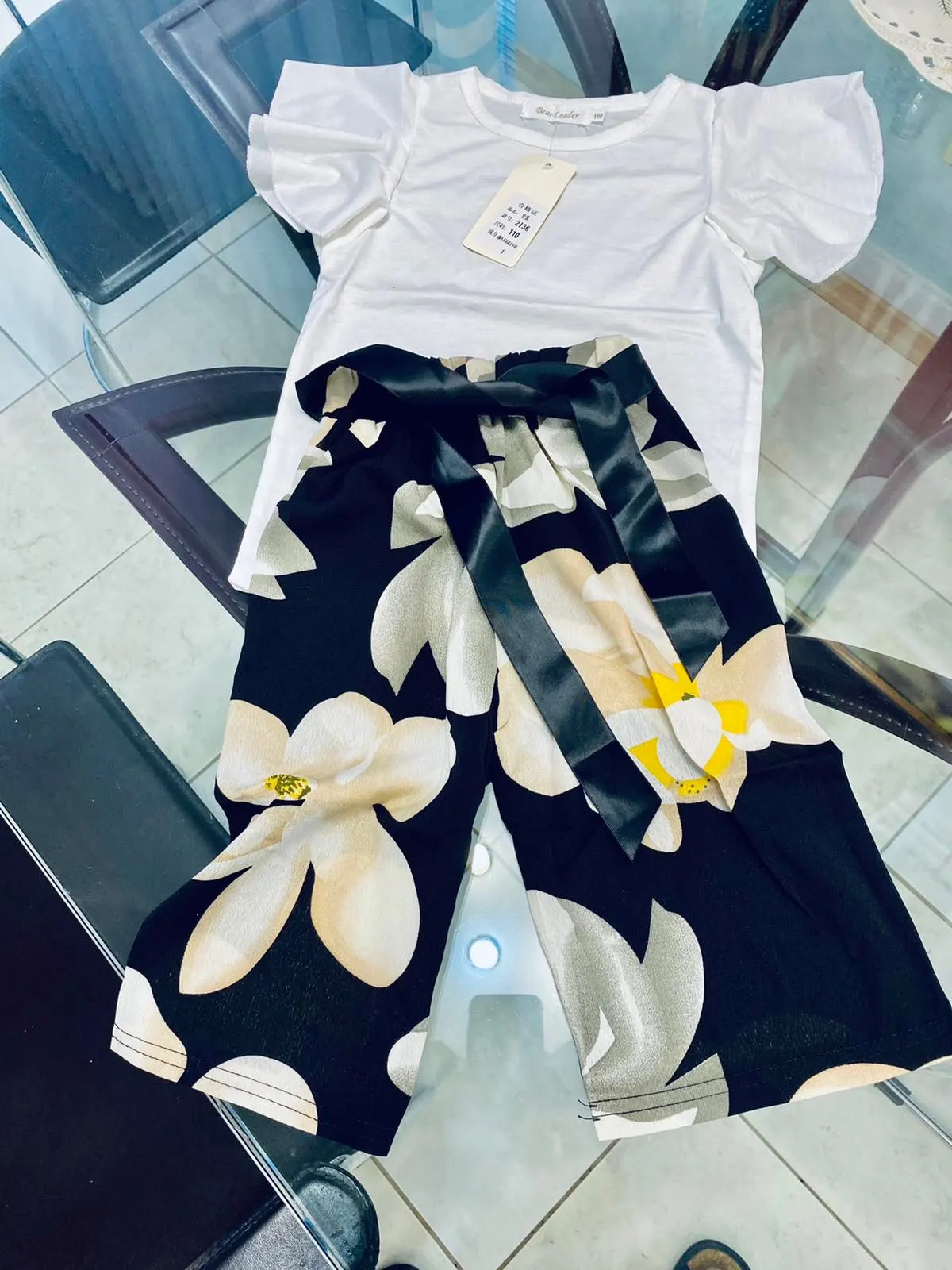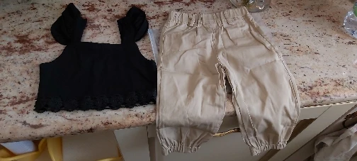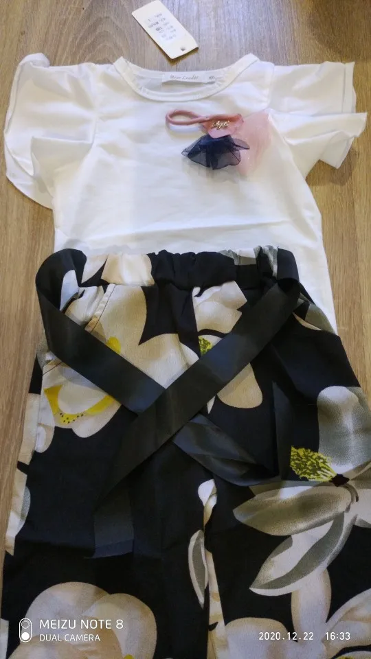Комплект хорошенький. Верх трикотаж, брюки шифон. Нам немного великоват, но к началу лета будет отлично.