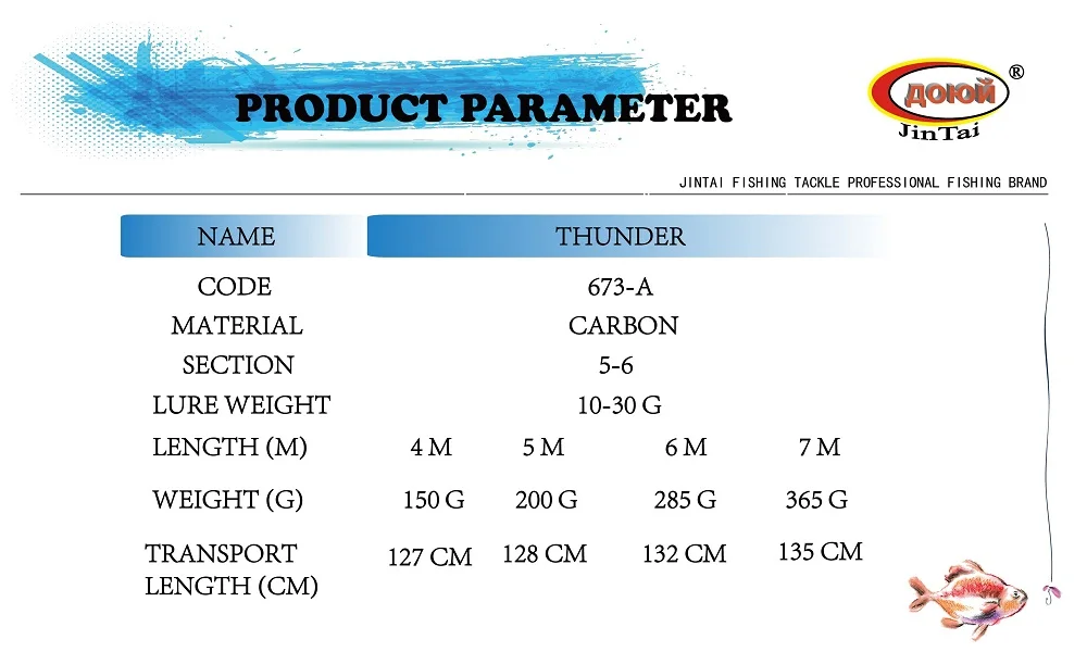 673A-1030 THUNDER CARBON Строй средне быстрый. Тест C.W. 10-30 гр. Длина: 4,0м 5,0м 6,0м 7,0м Удочка ДОЮЙ JinTai телескопическая. ModerateFast. Удилище