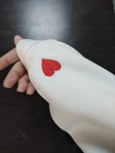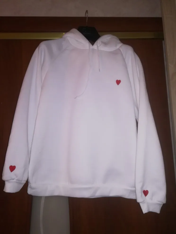 Толстовка мриехала за месяц до Москвы. Толстовка очень мягкая и тёплая, достаточно обьёмная, но маленькая. Заказала XL на рост 158, чуть ниже паховой зоны. Достаточно легко пачкается, как и любая другая белая вещь, но очень легко отмывается ( некоторые маленькие пятна изчезли после влажных солфеток). После стирки появилась совсем немного катышков. Сердечки на руках и на груди качественные.