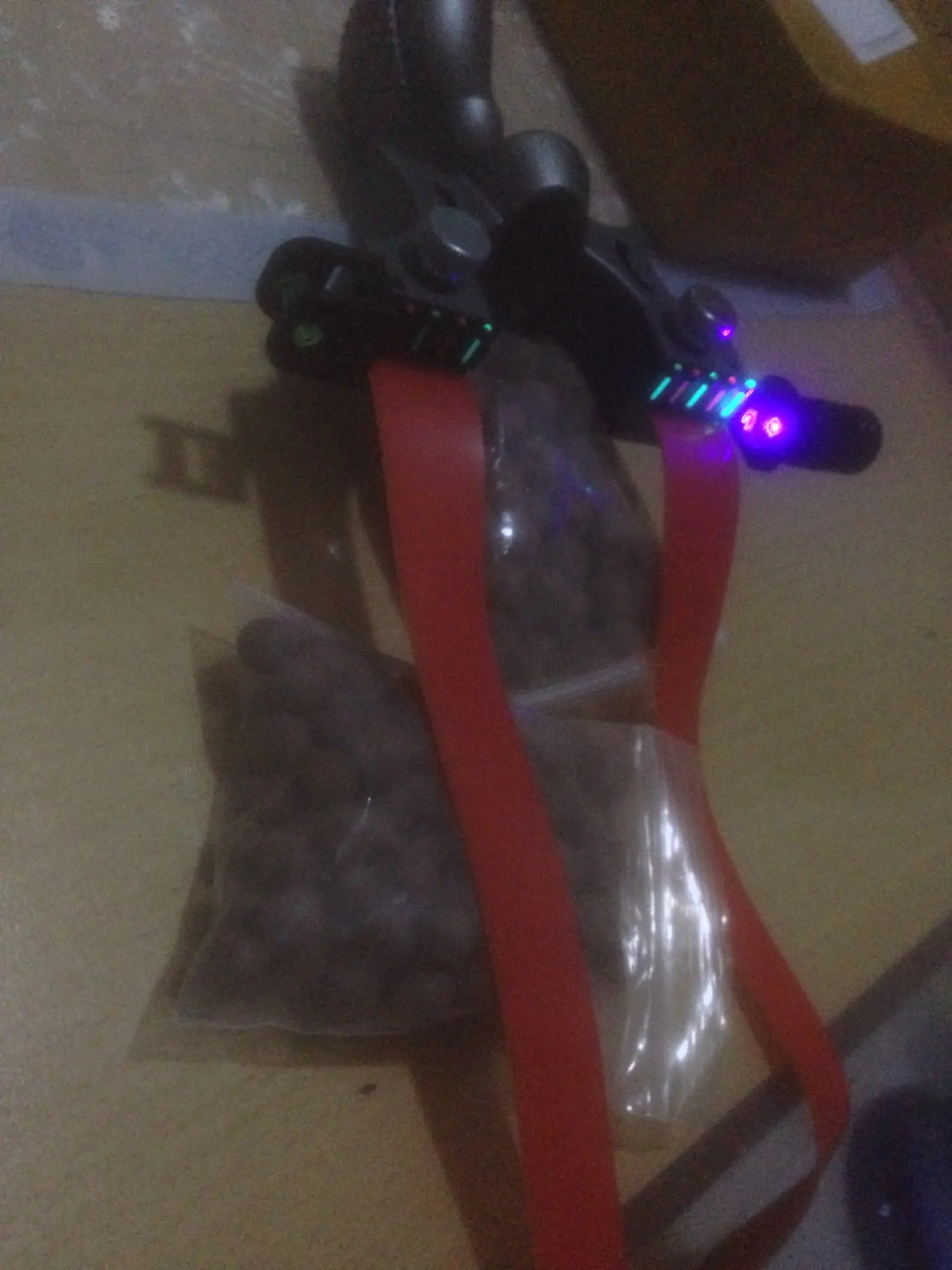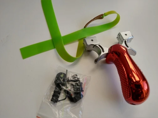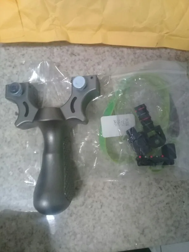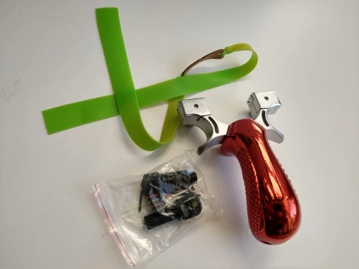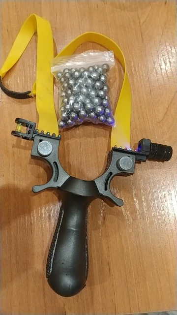 Доставлена на второй день после заказа курьером. Маленькая рогатка из неплохого пластика с совершенно не нужными прибамбасами типа лазерного прицела. Резина под замену, растянулась.