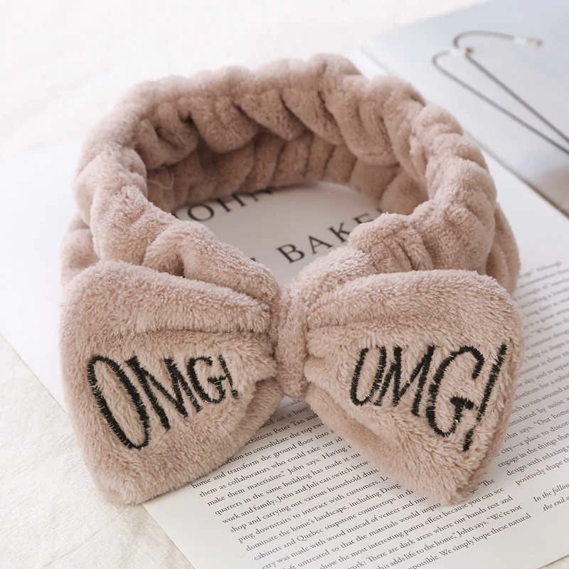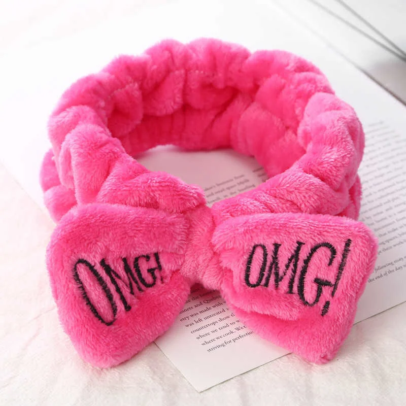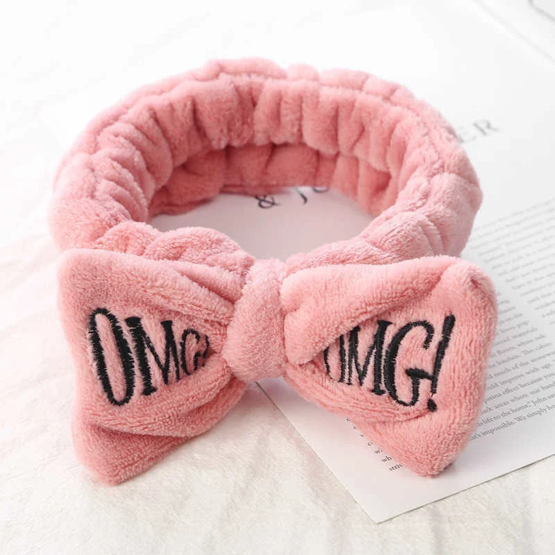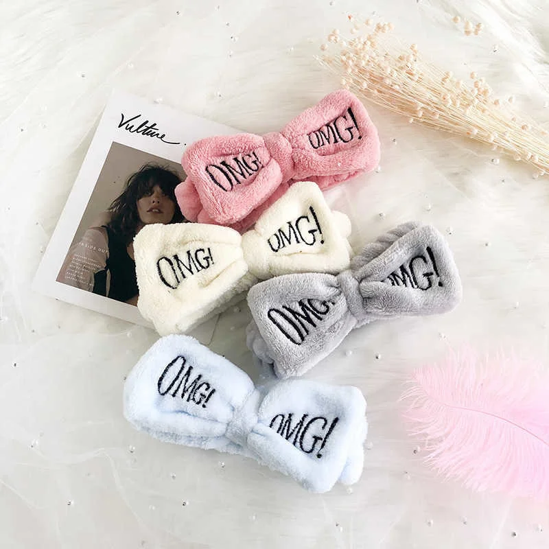 Женские повязки на голову с надписью OMG, мягкие флисовые повязки для волос кораллового цвета с бантиком, для девушек, для умывания лица, повязки для волос, аксессуары для волос