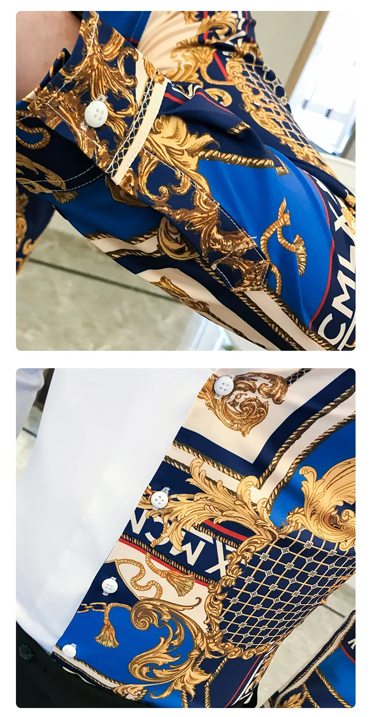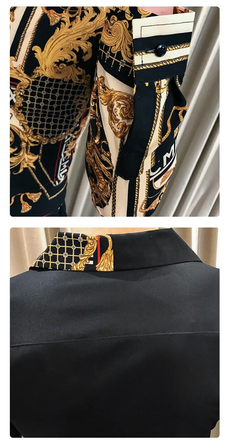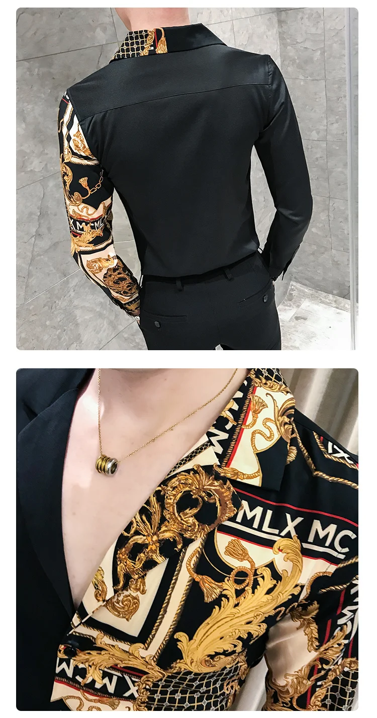 Повседневная рубашка, мужская приталенная Клубная рубашка с принтом для вечерние, роскошная черная Золотая рубашка, осень 201, стиль барокко, искусственная кожа, пэчворк