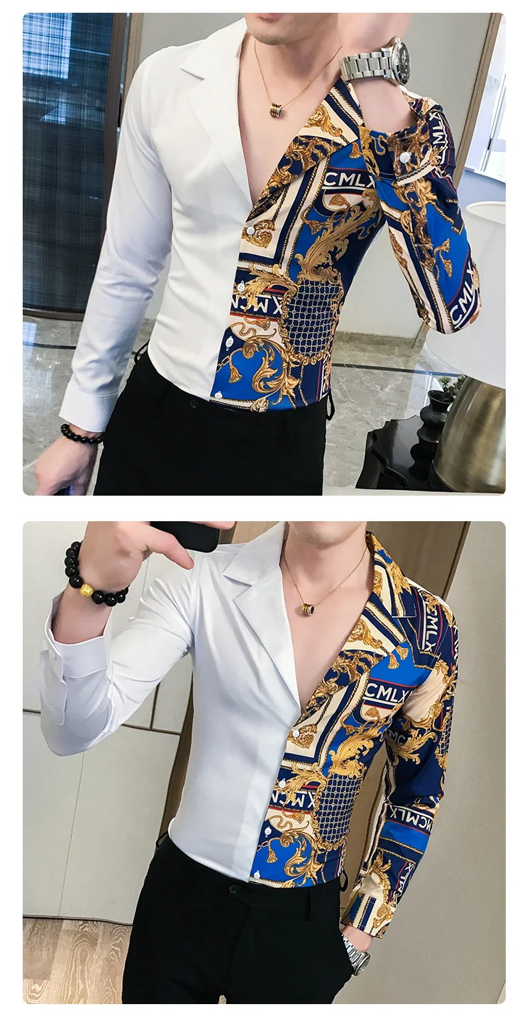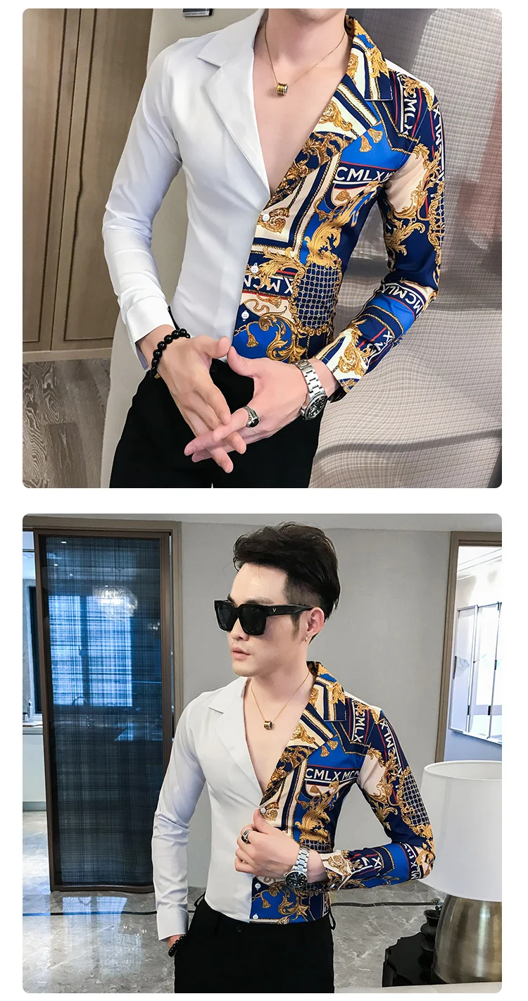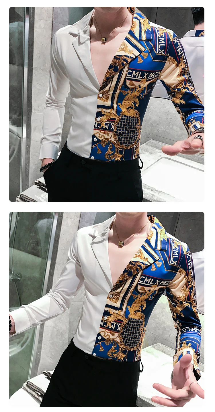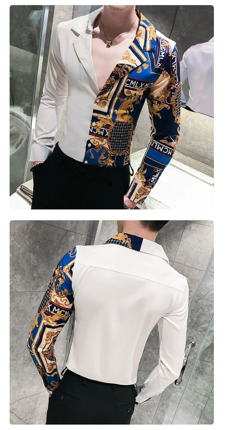 Повседневная рубашка, мужская приталенная Клубная рубашка с принтом для вечерние, роскошная черная Золотая рубашка, осень 201, стиль барокко, искусственная кожа, пэчворк