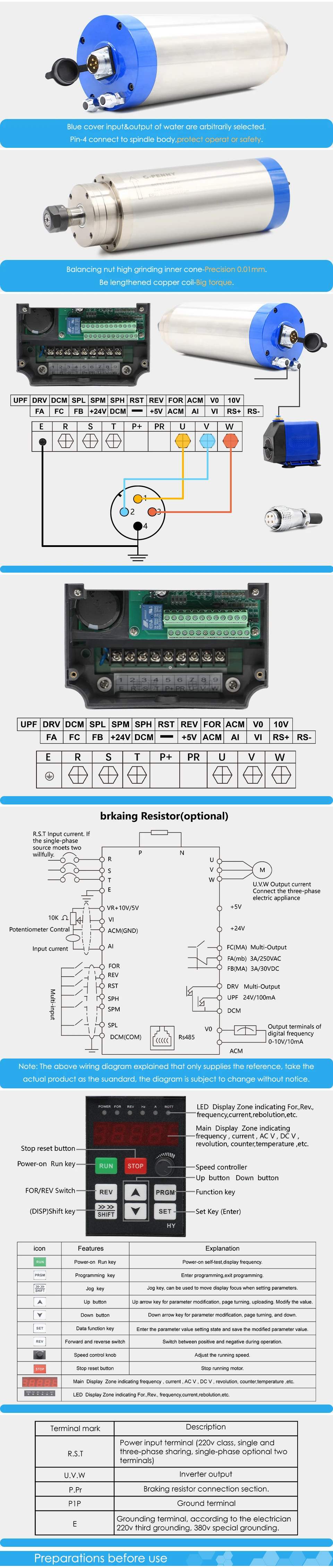 Шпиндель для сохранения и транспортировки, высокоскоростная смазка внутри подшипника изменится, клиенты должны работать на низкой скорости в течение 30 минут. 3000 об/мин, а затем следуйте за плохим увеличением, пробежите по 20 минут каждый. Шпиндель и инвертор должны работать вместе. Характеристики и параметры инвертора должны соответствовать параметрам шпинделей.