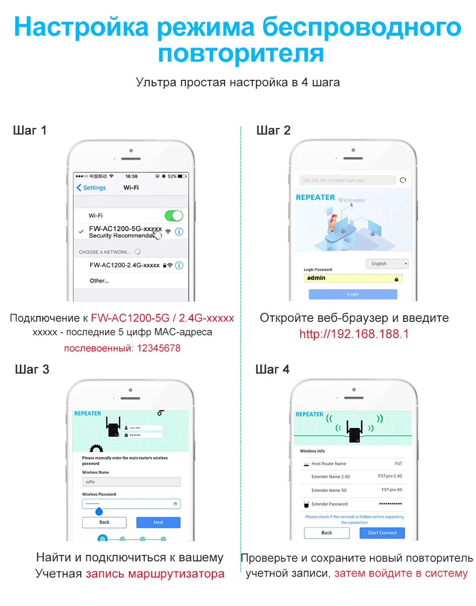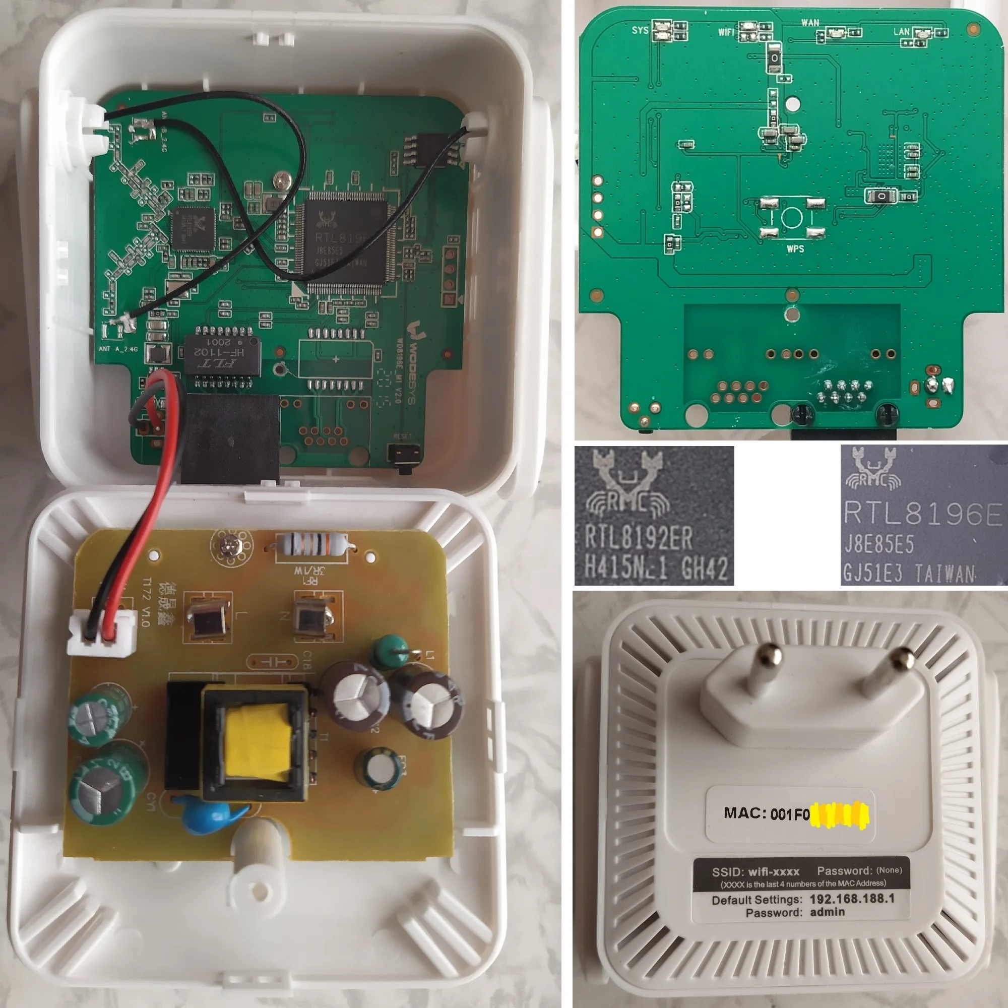 Пока что доволен. При первом включении появляется открытая сеть wifi_xxxx, подключился к ней, зашёл на 192.168.188.1 (пароль: admin), поиском выбрал какую сеть буду расширять, настроил имя новой сети и шифрование. Создаётся дополнительная новая сеть. Пример моих действий на второй фото. У меня интернет 30Mb/80Mbps (входящий/исходящий). Если репитер поставить в той же комнате, то скорость через него получается 25/20, а если поставить через стену, то скорость получилась 22/15, пинг увеличивается на пару ms. Снизу один LAN порт и кнопка Reset. Собрано на RTL8192ER+RTL8196E на плате маркировка WD8196E_M1 V2.0 2015. Firmware: LHRE96281219V1.05. Потребляет в среднем 2,2W (2-3,6W). WiFi видеокамеры у меня через него по WiFi почему-то не работают, только если подключить через LAN. Из плюсов: простота настройки; работает в той же сети, что и основной WiFi (как мост). Из минусов: мало настроек, не работают WiFi камеры. Выслали сразу же. Приехало за 19 дней, в коробочке и в пакете. Отслеживалось.