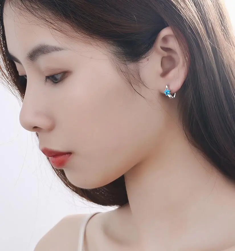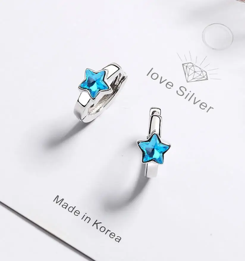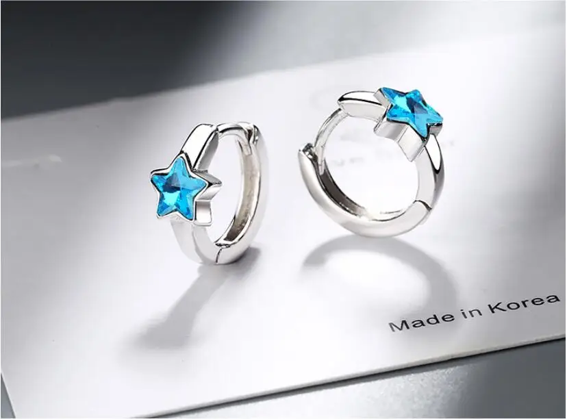 Cute Blue Crystal Stars 925 Sterling Silver Circles Small Loops Hug...