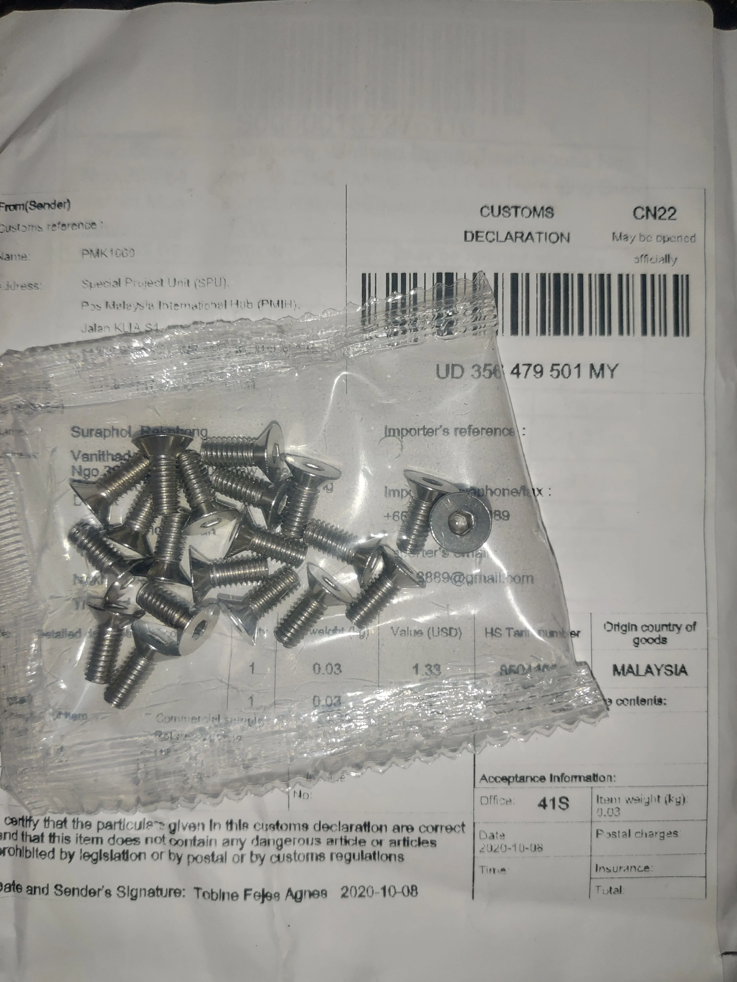 Кажется, очень хорошее качество винтов Inbus. Из-за переноса данных COVID требуется больше времени.