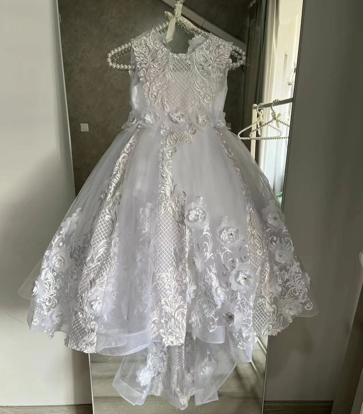 Пышное белое платье цвета слоновой кости с цветочным рисунком, кружевное бальное платье принцессы без рукавов с аппликацией, платье для первого причастия