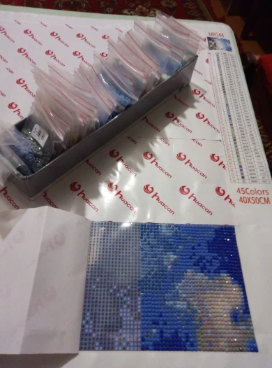 Посылка пришла быстро, за три недели со дня заказа. С продавцом общалась, спасибо, продавец вежливый и внимательный, отвечает на просьбы. Товар весь высокого качества. Попробовала сразу вылаживать алмазки, качество высокое, символы чёткие, липкий слой хороший. РЕКОМЕНДУЮ ЭТОТ МАГАЗИН. Подписываюсь и буду еще заказывать