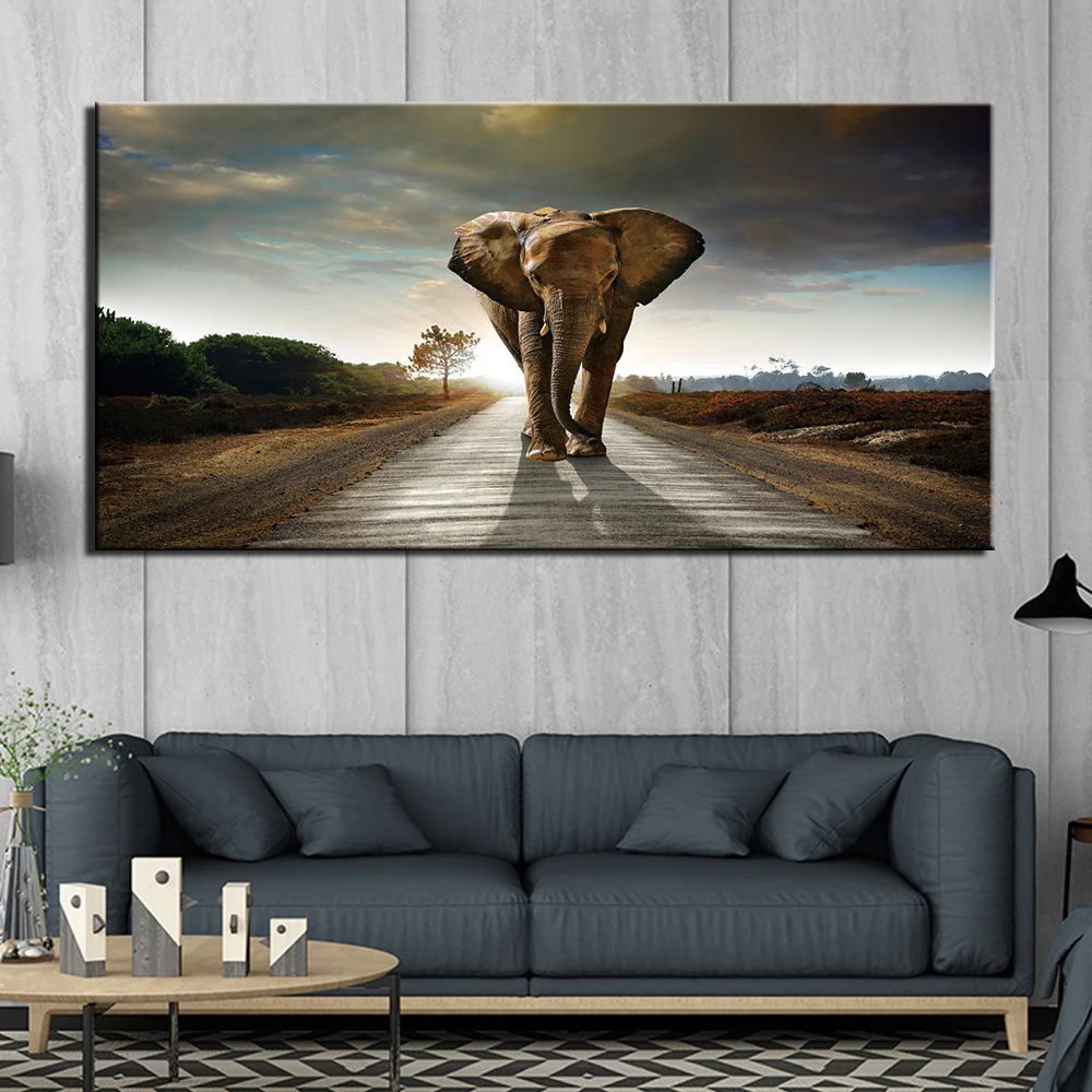 Холщовые настенные картины для гостиной, 1 шт., картины с африканскими животными, слоном на дороге, HD-принты, плакаты, рамка для рисования