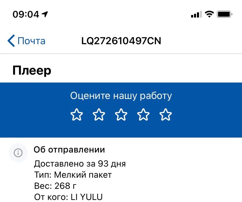 Сказать, что я в бешенстве, это ничего не сказать. 93 дня в пути.... это вообще как? Покупку совершили ещё в начале декабря. Больше месяца я терпеливо ждала. Пока наконец не написала продавцу. Оказалось он ничего и не отправил. Я открыла спор. Но он уже успел отправить этот плеер, без моего согласия на повторную отправку!!! Мне уже этот плеер такими сроками и у этого продавца не сдался. Ещё несколько месяцев ожидания. И вот плеер пришёл. Спасибо, что хоть работает.... самая долгая и муторная покупка за всю историю покупок на али....