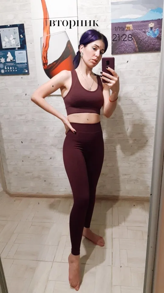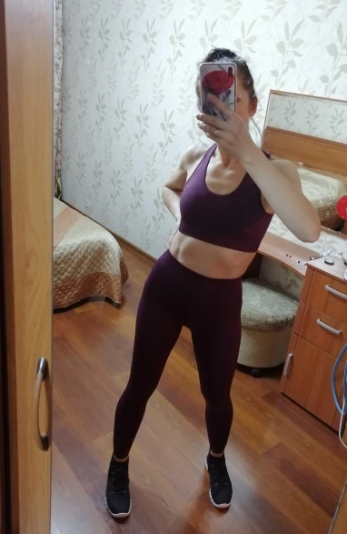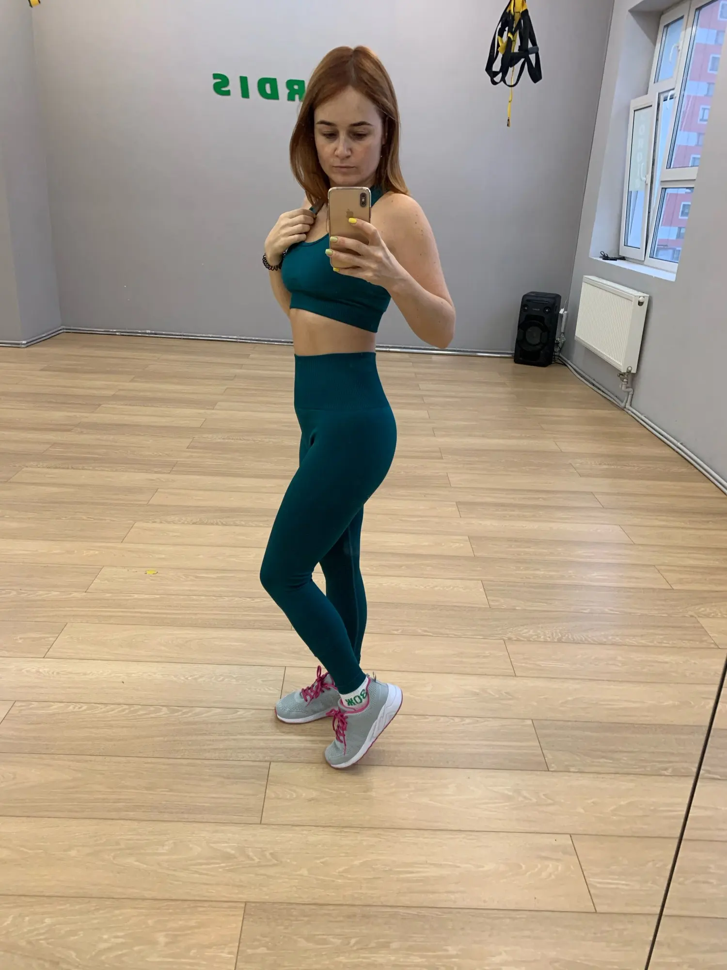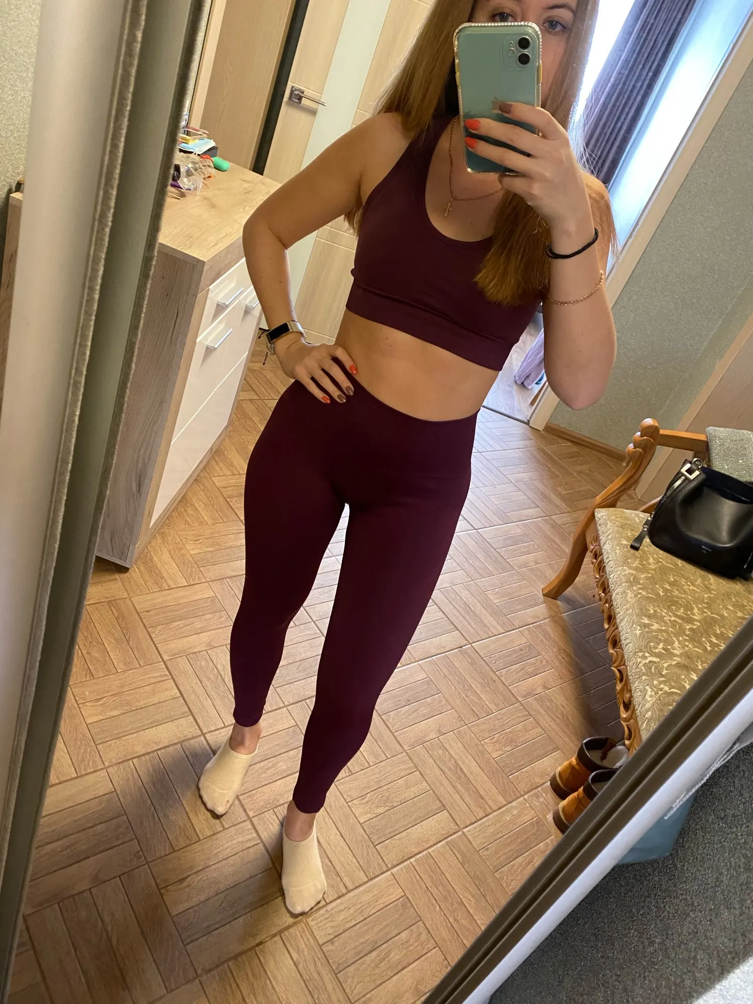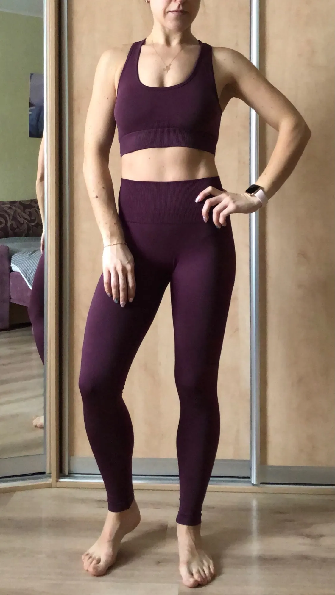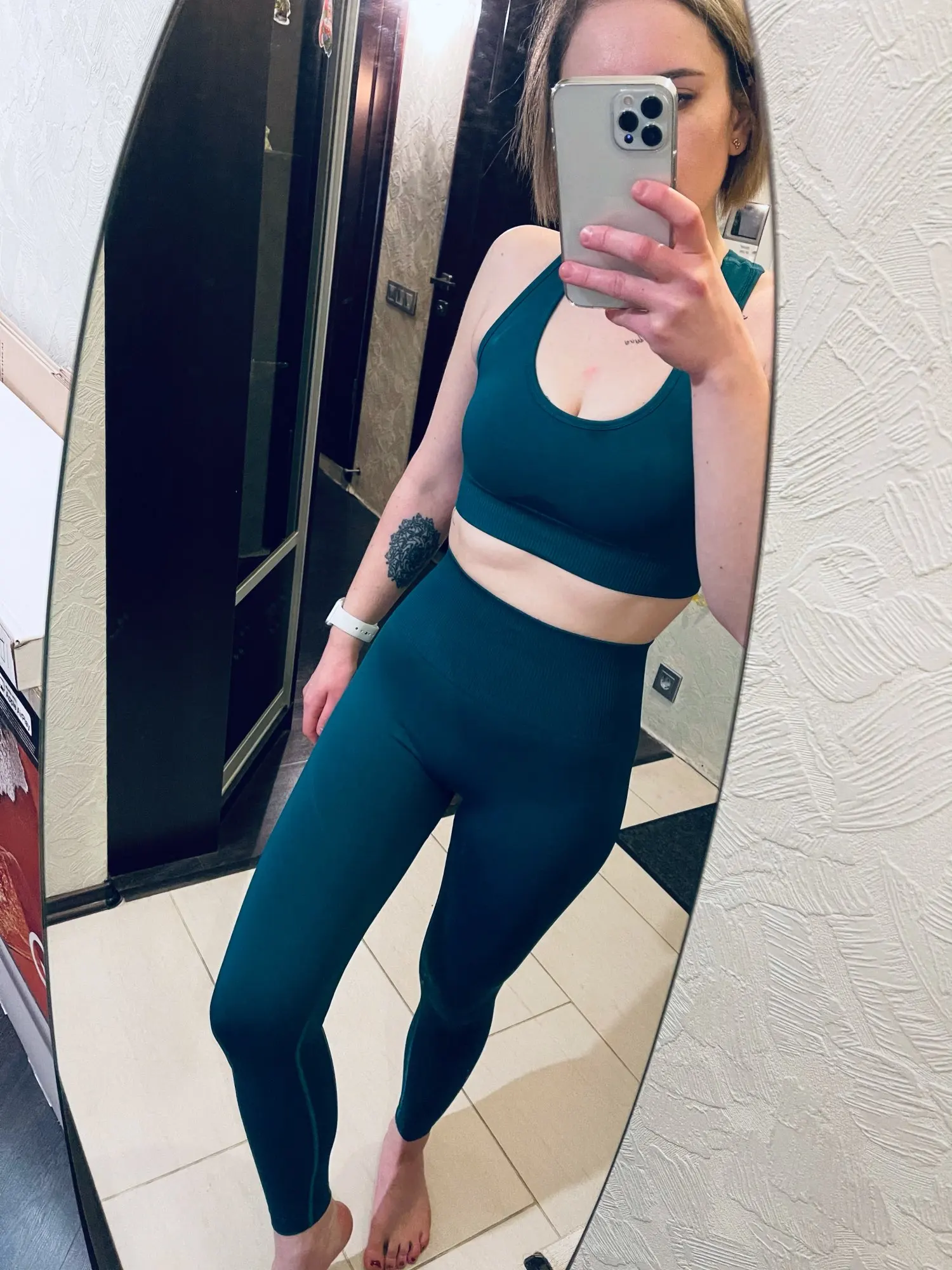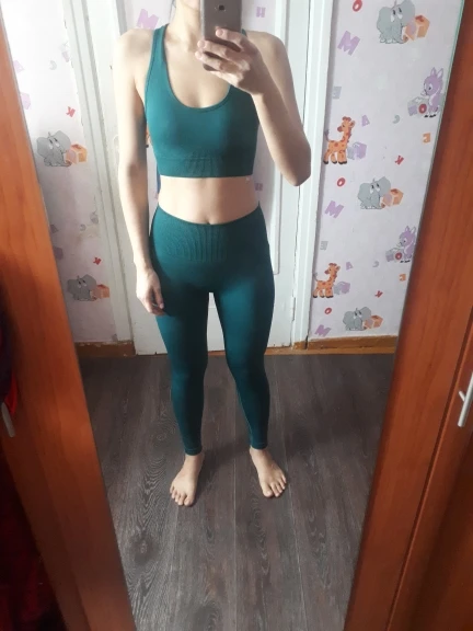 Костюм просто опупительный! Компрессия хорошая, мышцы все держит. Цвет точно как на фото. И он просто восхитительный. Переживала за топ, но зря. Сел хорошо, не плющит. Есть вставки-чашечки. Лосины не светят. А с бесшовным бельём вообще ничего видно не будет. Не смотря на то, что ткань плотная и с утяжкой, попу не уплощают. Довольна как слон! Посмотрю как в носке и закажу в других цветах. Доставка до Москвы быстрая в Пятёрочку. Спасибо продавцу.
