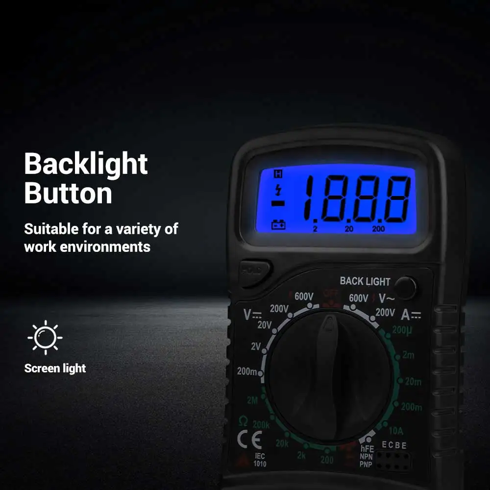 XL830L цифровой ЖК-мультиметр Вольтметр Амперметр AC DC Ом Вольт Тест er тестовый ток 100% абсолютно новое и высококачественное описание на 100% абсолютно новый и высокого качества Цвет: как показано на рисунке Особенности: Этот сверхмощный Универсальный мультиметр имеет четкий, легко читаемый ЖК-дисплей, С синей задней подсветкой защита от перегрузки на всех диапазонах, размещенных в прочном резиновом сапоге со встроенной подставкой с индикацией низкого напряжения батареи портативный и компактный дизайн Функция удержания данных и диодный тестовый Механизм 20 позиционный поворотный переключатель съемный толстый каучук корпус защищает мультиметр от брызг и мелких ударов измеряет напряжение переменного и постоянного тока, ток постоянного тока, сопротивление, Звуковая непрерывность, режим проверки диодов/транзисторов Примечание: Из-за разницы между различными мониторами изображение может не отражать фактический цвет изделия. Спасибо! Возможны погрешности в 0-1 см из-за ручного измерения. Возможны незначительные погрешности в измерениях. Посылка включает в себя: 1 х мультиметр (батарея в комплект не входит) 2 х тестовая линия 1 х Инструкция по эксплуатации