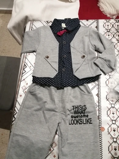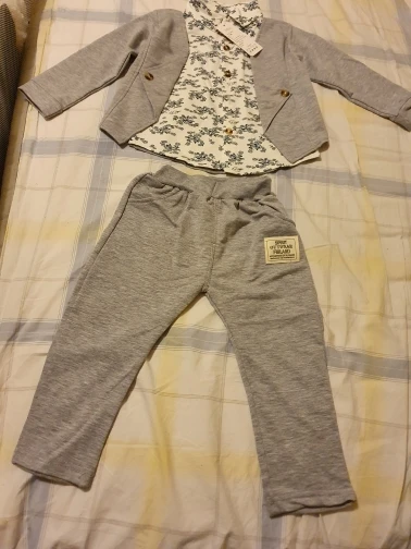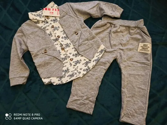 Красивый костюм из плотного трикотажа. Качество хорошее, выглядит стильно. На возраст два года заказала 3т, подошло с небольшим запасом, мальчик худенький рост 90. Рекомендую к покупке товар и продавца. Камера не очень, в реальности костюм выглядит лучше.